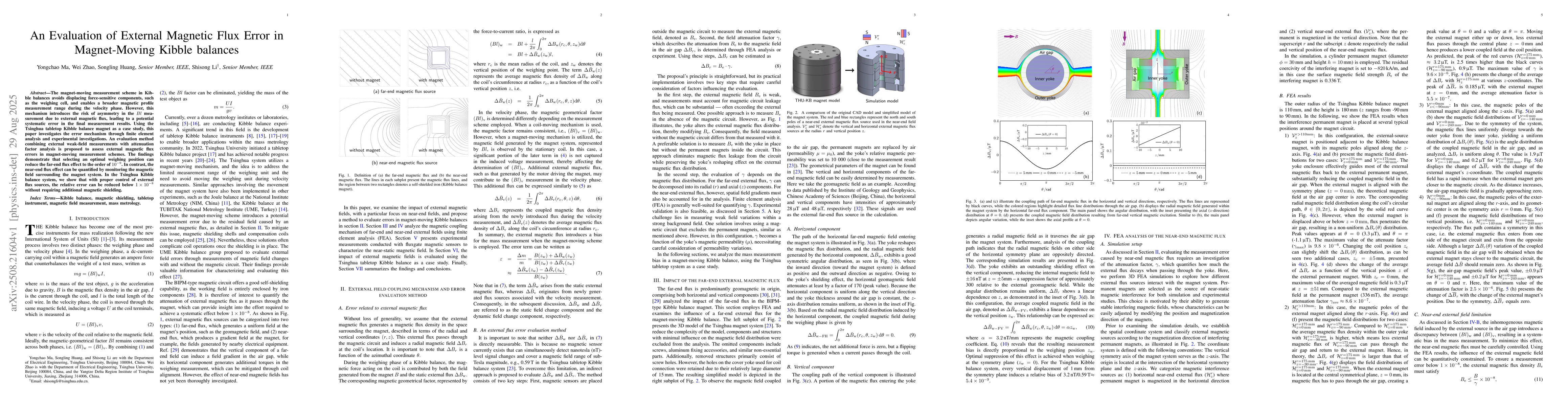 The magnet-moving measurement scheme in Kibble balances avoids displacing force-sensitive components, such as the weighing cell, and enables a broader magnetic profile measurement range during the velocity phase. However, this mechanism introduces the risk of asymmetry in the $Bl$ measurement due to external magnetic flux, leading to a potential systematic error in the final measurement results. Using the Tsinghua tabletop Kibble balance magnet as a case study, this paper investigates the error mechanism through finite element analysis and experimental investigations. An evaluation method combining external weak-field measurements with attenuation factor analysis is proposed to assess external magnetic flux errors in magnet-moving measurement schemes. The findings demonstrate that selecting an optimal weighing position can reduce the far-end flux effect to the order of $10^{-9}$. In contrast, the near-end flux effect can be quantified by monitoring the magnetic field surrounding the magnet system. In the Tsinghua Kibble balance system, we show that with proper control of external flux sources, the relative error can be reduced below $1 \times 10^{-8}$ without requiring additional magnetic shielding.