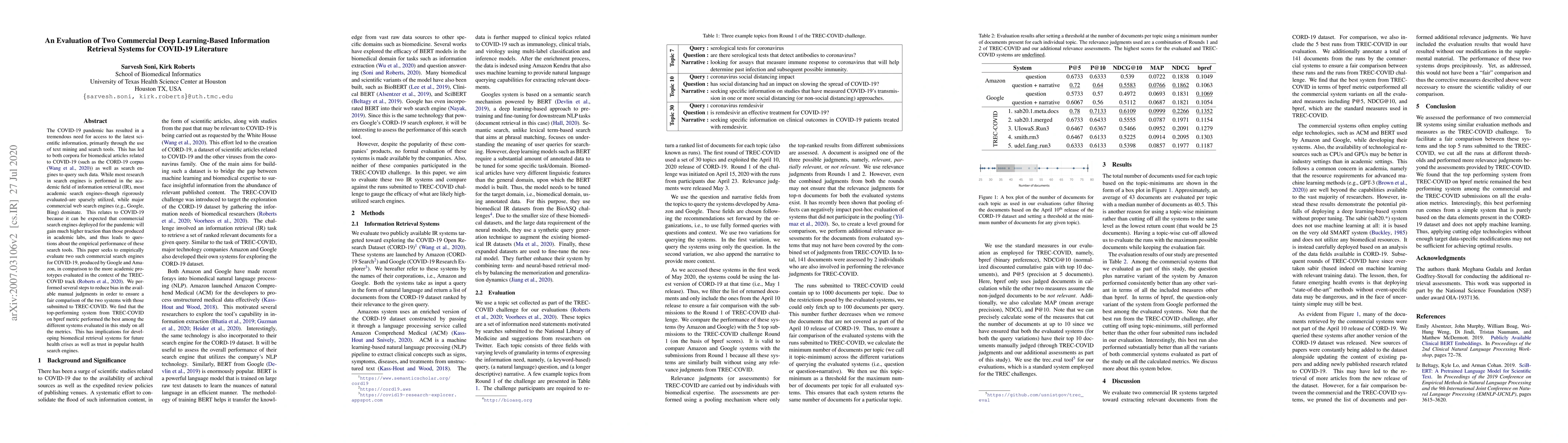 Two commercial deep learning-based search engines for COVID-19 literature, from Google and Amazon, were evaluated against an academic prototype in a fair comparison. The top-performing system outperformed the others on most metrics, with implications for developing biomedical retrieval systems for future health crises.