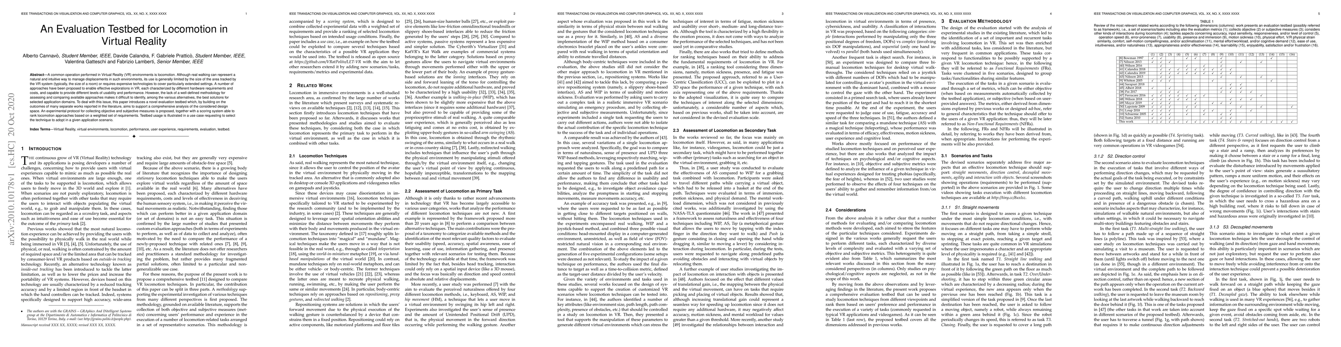 This paper introduces a novel evaluation testbed for assessing various locomotion methods in Virtual Reality, proposing an experimental protocol and scoring system to compare different approaches based on usability and performance, and demonstrating its application in selecting the best technique for a given scenario.