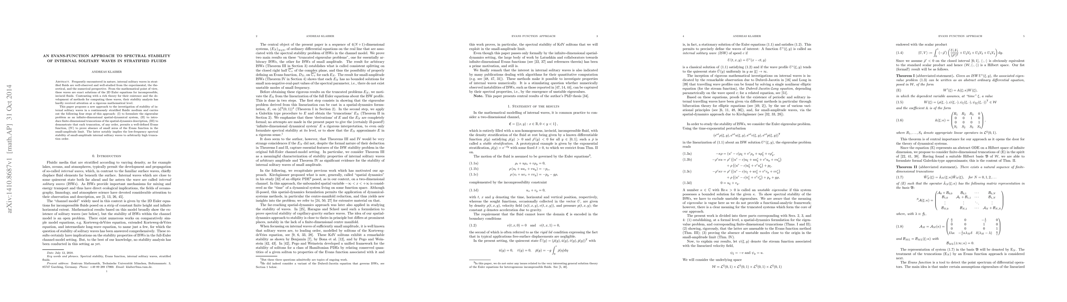 This paper proposes a novel Evans-function approach to rigorously analyze the spectral stability of internal solitary waves in stratified fluids, demonstrating the absence of small zeros of the Evans function, which implies low-frequency spectral stability for small-amplitude waves.
