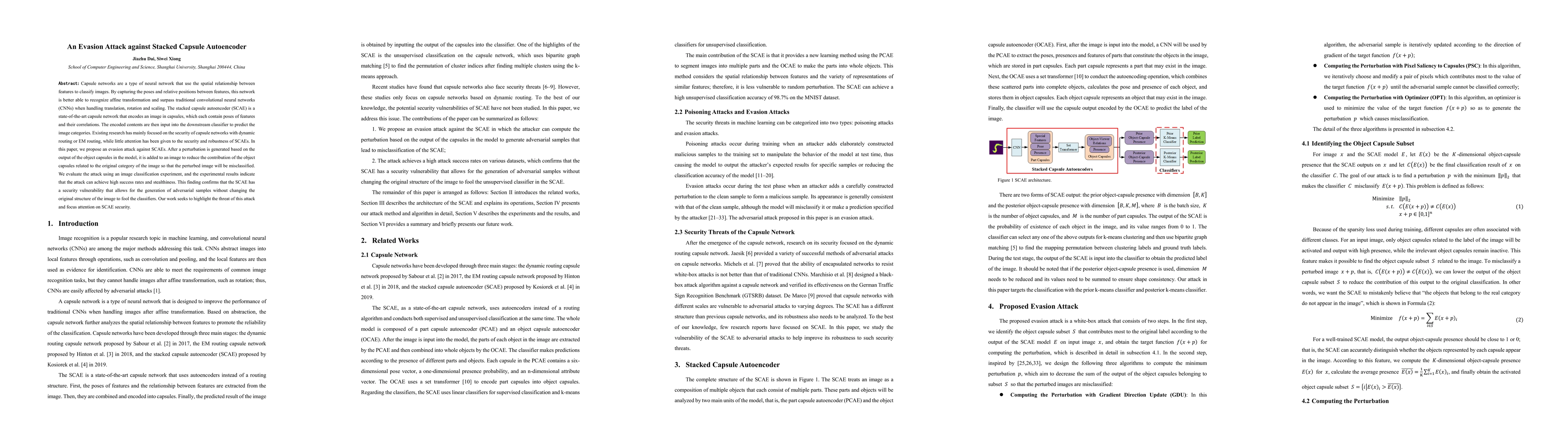 This paper proposes an evasion attack against the Stacked Capsule Autoencoder (SCAE), demonstrating that it is vulnerable to adversarial samples. The attack generates perturbations based on the output of object capsules to misclassify images, achieving high success rates without altering the image structure, thus highlighting the SCAE's security weaknesses.