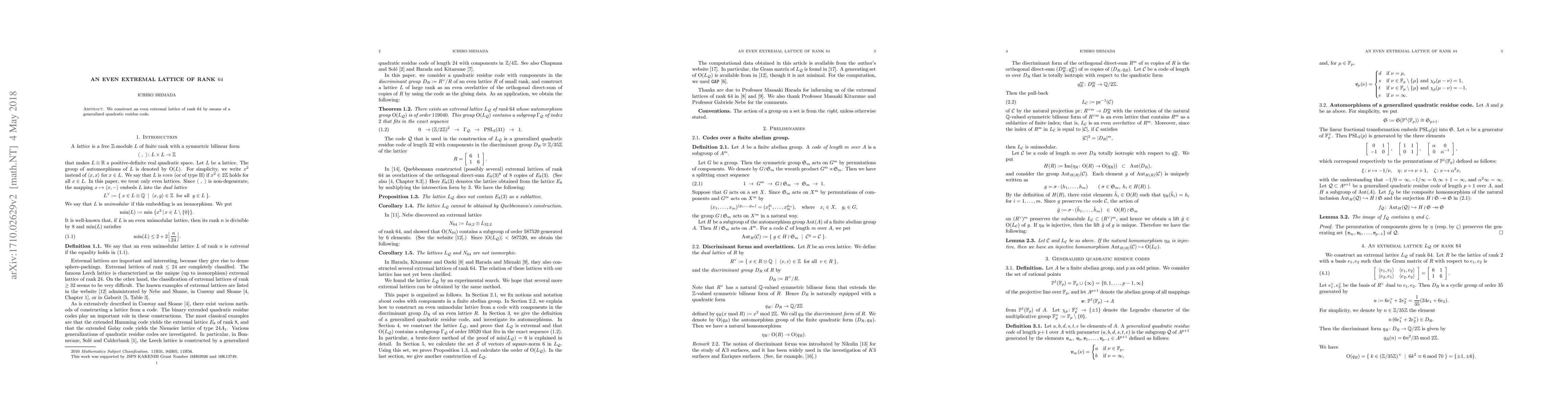 Researchers created an even extremal lattice of rank 64 using a generalized quadratic residue code, achieving a significant milestone in coding theory.