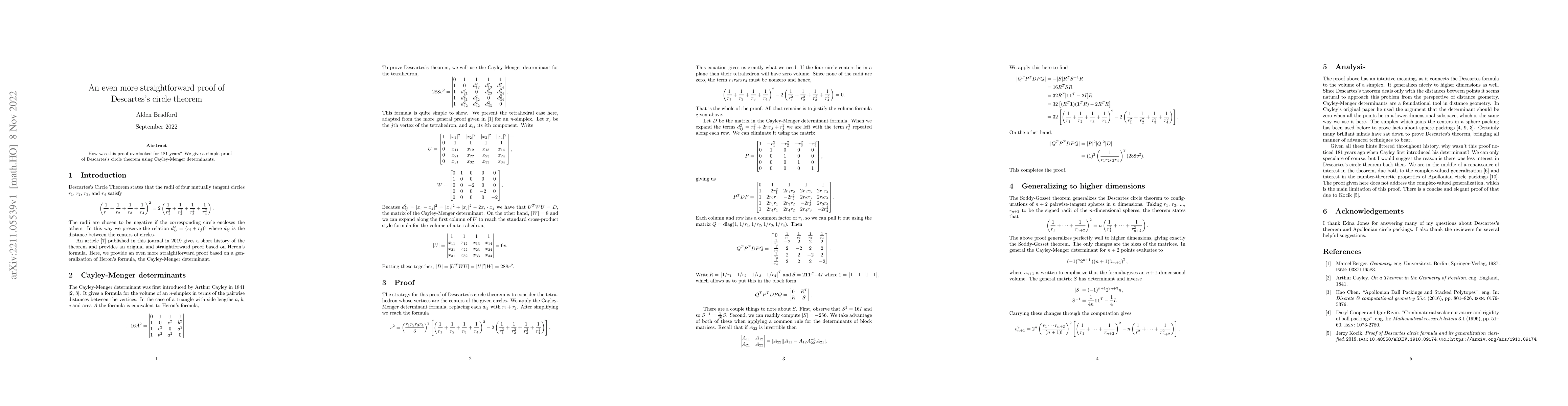 Summary: This paper presents a straightforward proof of Descartes's circle theorem utilizing Cayley-Menger determinants, addressing why this simpler approach was overlooked for nearly two centuries.