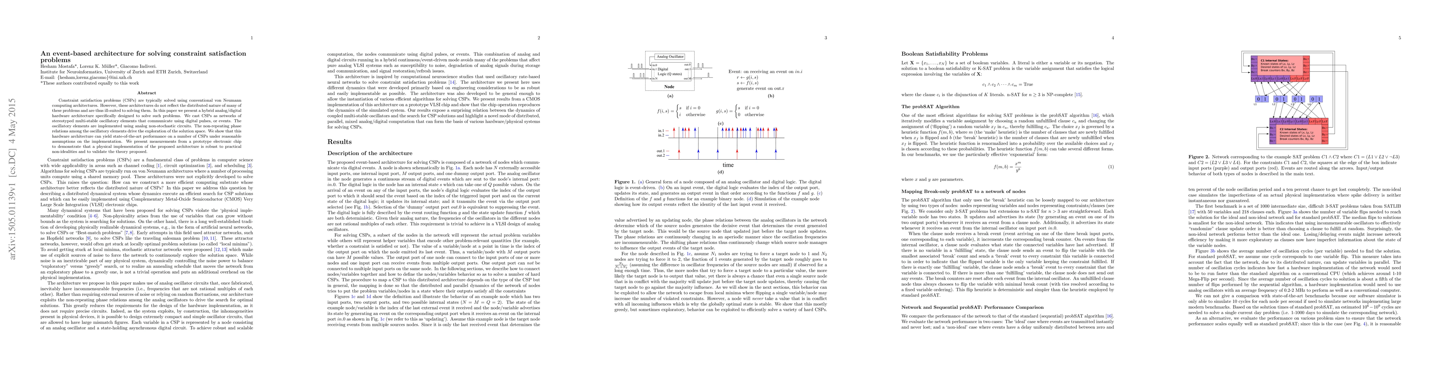 This paper introduces a hybrid analog/digital hardware architecture for solving constraint satisfaction problems (CSPs) by modeling them as networks of oscillatory elements that communicate via digital pulses. The architecture demonstrates state-of-the-art performance on CSPs and is validated through a prototype electronic chip, showing robustness to practical non-idealities.