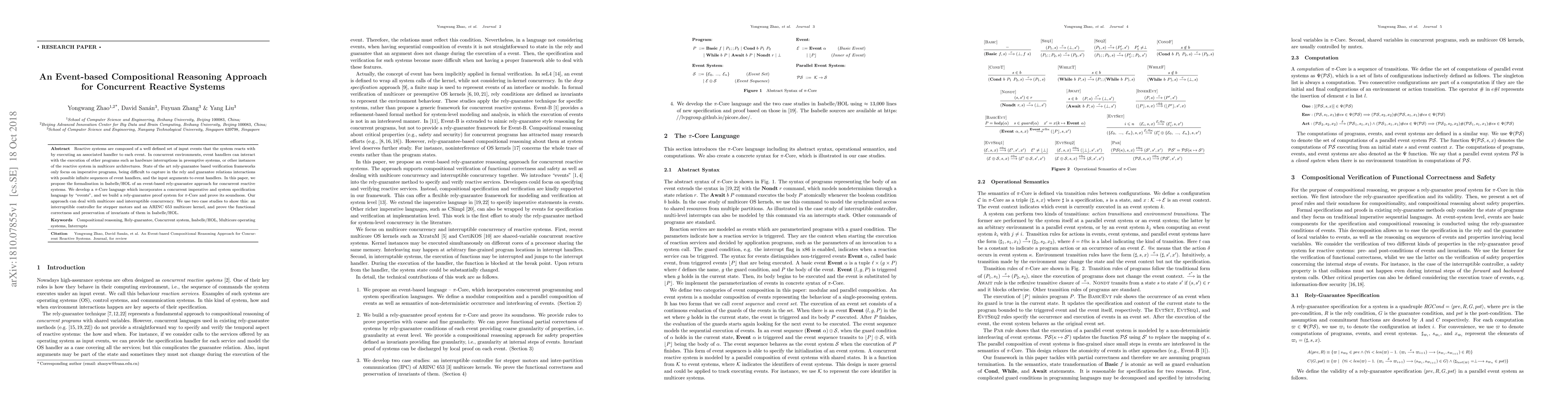 This paper proposes an event-based compositional reasoning approach for verifying concurrent reactive systems using Isabelle/HOL, introducing a Pi-Core language and a rely-guarantee proof system. It demonstrates the method's effectiveness through case studies of a motor controller and an ARINC 653 multicore kernel.