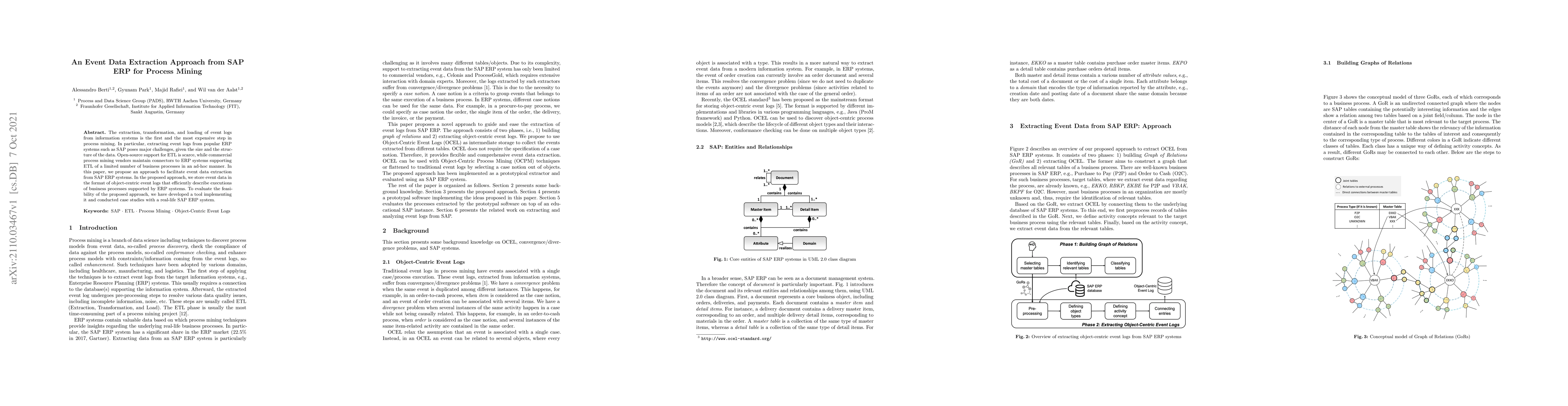 This paper proposes an approach to extract event data from SAP ERP systems for process mining, addressing the challenges of data size and structure. The approach stores event data in object-centric logs and was evaluated through a tool implementation and real-life case studies.