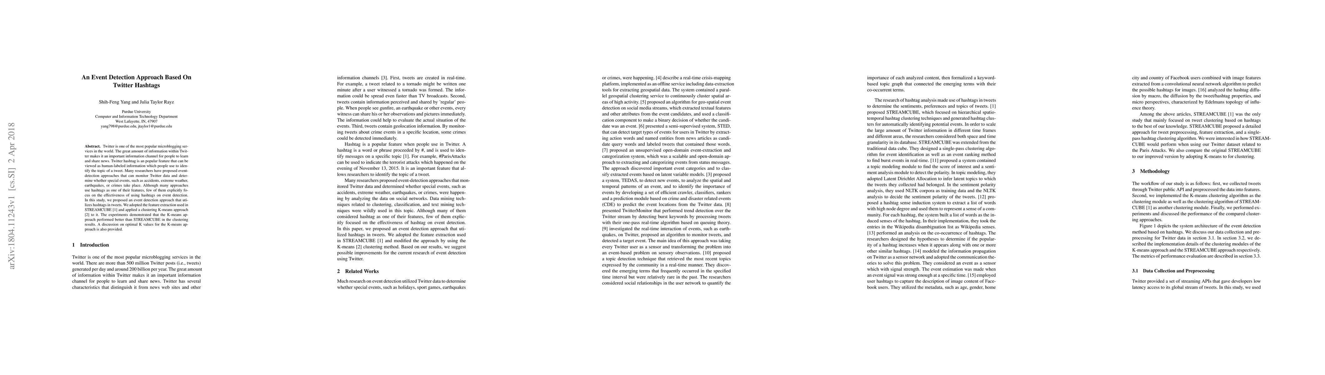 This paper proposes an event detection method leveraging Twitter hashtags to identify significant occurrences like accidents or crimes. The study compares a K-means clustering approach with STREAMCUBE, finding that K-means yields better clustering results, and discusses the optimal number of clusters for effective event detection.