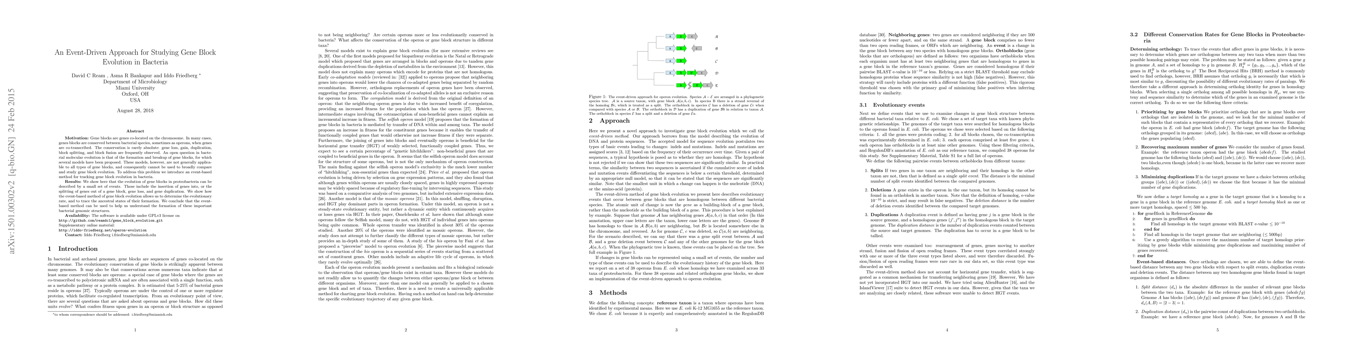 Motivation: Gene blocks are genes co-located on the chromosome. In many cases, genes blocks are conserved between bacterial species, sometimes as operons, when genes are co-transcribed. The conservation is rarely absolute: gene loss, gain, duplication, block splitting, and block fusion are frequently observed. An open question in bacterial molecular evolution is that of the formation and breakup of gene blocks, for which several models have been proposed. These models, however, are not generally applicable to all types of gene blocks, and consequently cannot be used to broadly compare and study gene block evolution. To address this problem we introduce an event-based method for tracking gene block evolution in bacteria. Results: We show here that the evolution of gene blocks in proteobacteria can be described by a small set of events. Those include the insertion of genes into, or the splitting of genes out of a gene block, gene loss, and gene duplication. We show how the event-based method of gene block evolution allows us to determine the evolutionary rate, and to trace the ancestral states of their formation. We conclude that the event-based method can be used to help us understand the formation of these important bacterial genomic structures. Availability: The software is available under GPLv3 license on http://github.com/reamdc1/gene_block_evolution.git Supplementary online material: http://iddo-friedberg.net/operon-evolution Contact: Iddo Friedberg [email protected]