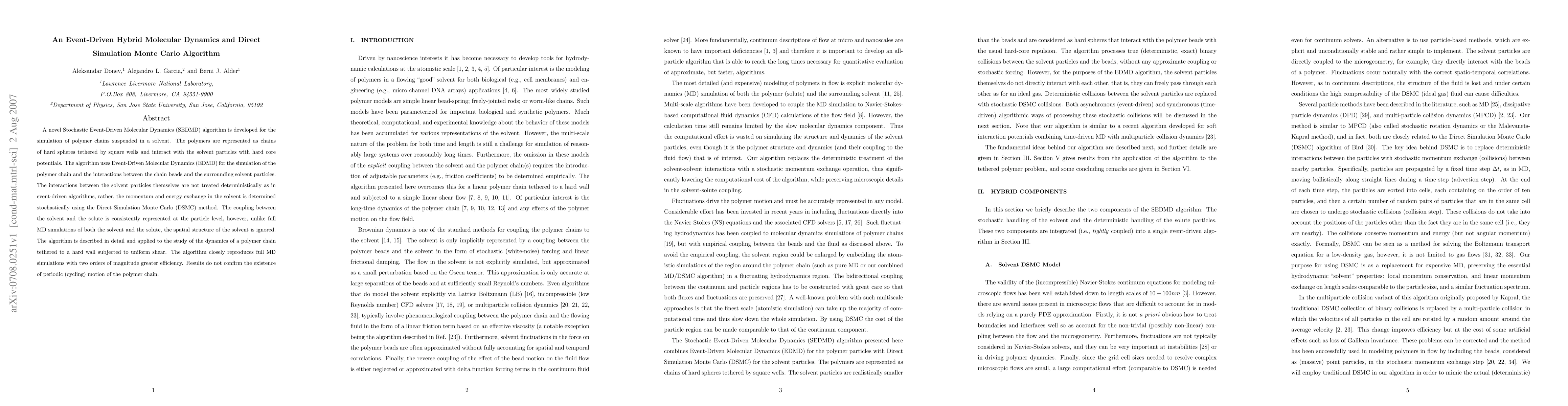 This paper introduces a novel SEDMD algorithm combining Event-Driven Molecular Dynamics and Direct Simulation Monte Carlo for efficient polymer chain simulations. It shows the algorithm's efficiency and accuracy, finding no evidence for periodic motion in polymer chains under shear.