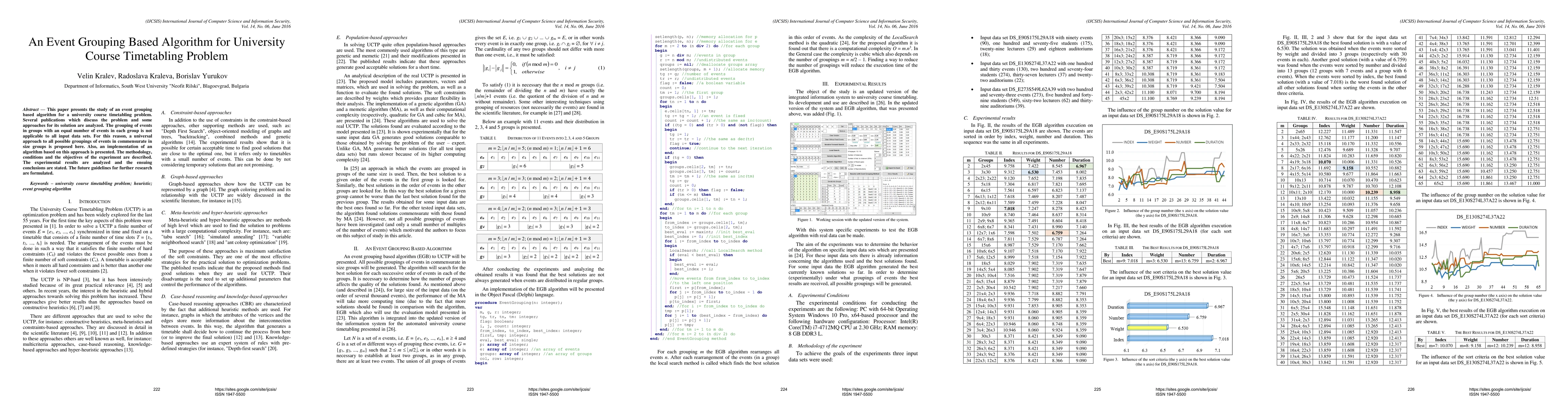 This paper presents the study of an event grouping based algorithm for a university course timetabling problem. Several publications which discuss the problem and some approaches for its solution are analyzed. The grouping of events in groups with an equal number of events in each group is not applicable to all input data sets. For this reason, a universal approach to all possible groupings of events in commensurate in size groups is proposed here. Also, an implementation of an algorithm based on this approach is presented. The methodology, conditions and the objectives of the experiment are described. The experimental results are analyzed and the ensuing conclusions are stated. The future guidelines for further research are formulated.