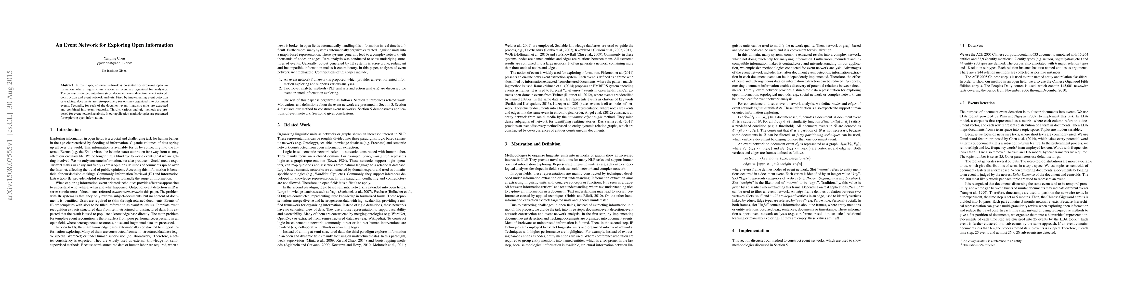 In this paper, an event network is presented for exploring open information, where linguistic units about an event are organized for analysing. The process is divided into three steps: document event detection, event network construction and event network analysis. First, by implementing event detection or tracking, documents are retrospectively (or on-line) organized into document events. Secondly, for each of the document event, linguistic units are extracted and combined into event networks. Thirdly, various analytic methods are proposed for event network analysis. In our application methodologies are presented for exploring open information.
