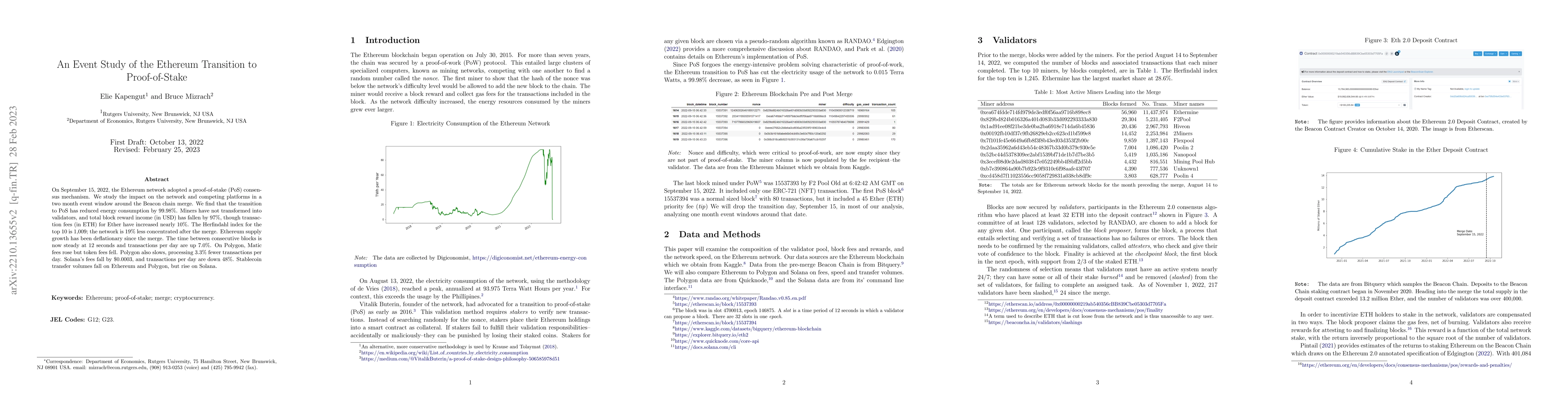 On September 15, 2022, the Ethereum network adopted a proof-of-stake (PoS) consensus mechanism. We study the impact on the network and competing platforms in a two month event window around the Beacon chain merge. We find that the transition to PoS has reduced energy consumption by 99.98%. Miners have not transformed into validators, and total block reward income (in USD) has fallen by 97%, though transaction fees (in ETH) for Ether have increased nearly 10%. The Herfindahl index for the top 10 is 1,009; the network is 19% less concentrated after the merge. Ethereum supply growth has been deflationary since the merge. The time between consecutive blocks is now steady at 12 seconds and transactions per day are up 7.0%. On Polygon, Matic fees rose but token fees fell. Polygon also slows, processing 3.3% fewer transactions per day. Solana's fees fall by $0.0003, and transactions per day are down 48%. Stablecoin transfer volumes fall on Ethereum and Polygon, but rise on Solana.