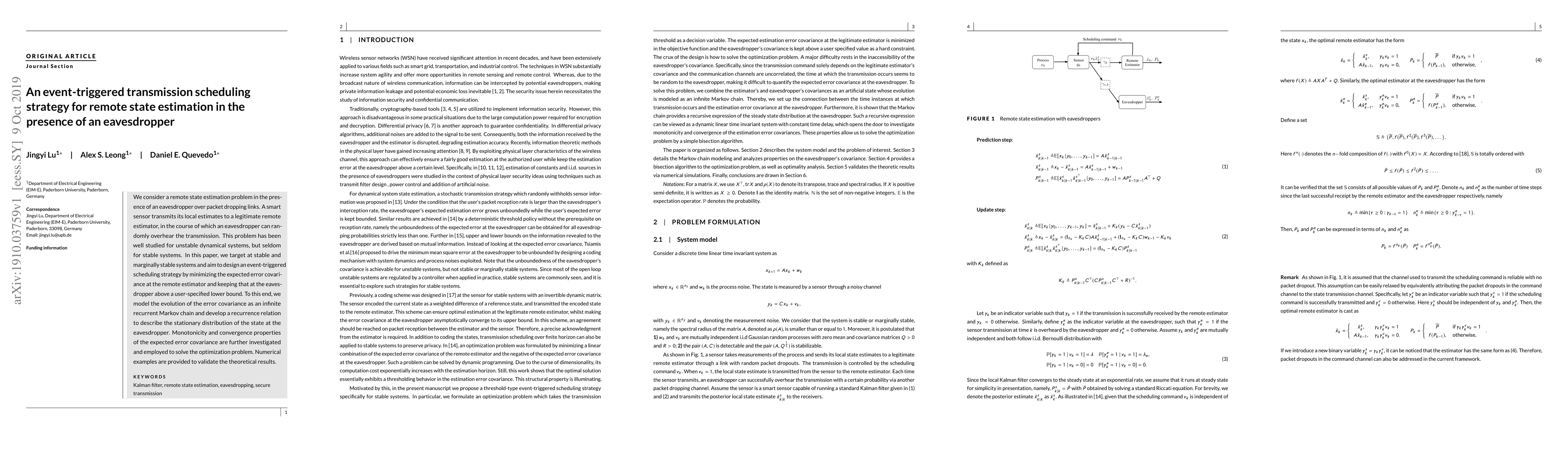We consider a remote state estimation problem in the presence of an eavesdropper over packet dropping links. A smart sensor transmits its local estimates to a legitimate remote estimator, in the course of which an eavesdropper can randomly overhear the transmission. This problem has been well studied for unstable dynamical systems, but seldom for stable systems. In this paper, we target at stable and marginally stable systems and aim to design an event-triggered scheduling strategy by minimizing the expected error covariance at the remote estimator and keeping that at the eavesdropper above a user-specified lower bound. To this end, we model the evolution of the error covariance as an infinite recurrent Markov chain and develop a recurrence relation to describe the stationary distribution of the state at the eavesdropper. Monotonicity and convergence properties of the expected error covariance are further investigated and employed to solve the optimization problem. Numerical examples are provided to validate the theoretical results.