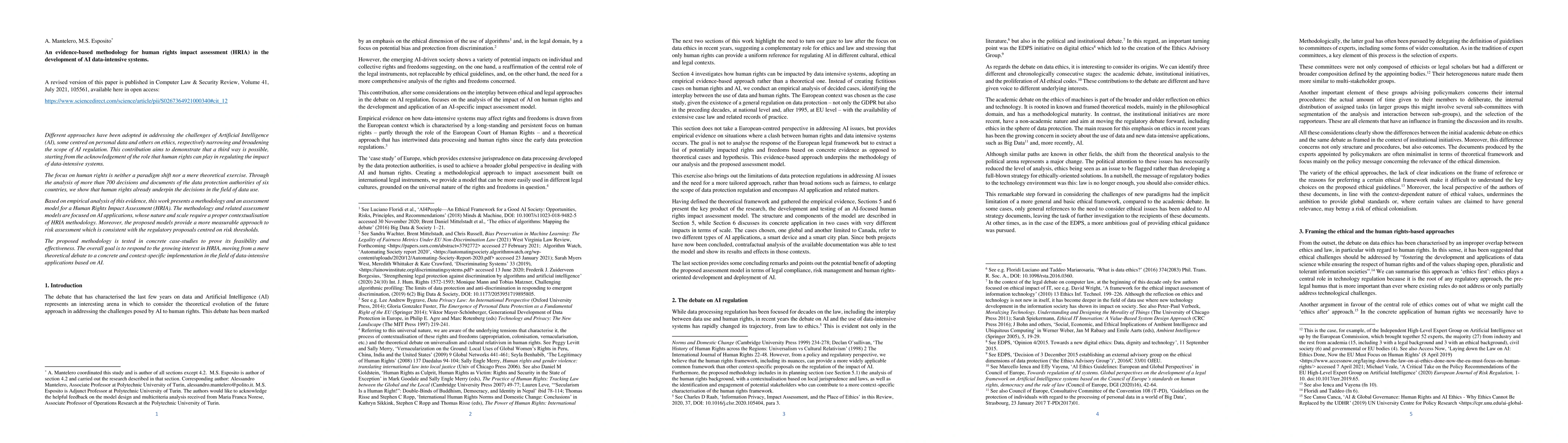 Different approaches have been adopted in addressing the challenges of Artificial Intelligence (AI), some centred on personal data and others on ethics, respectively narrowing and broadening the scope of AI regulation. This contribution aims to demonstrate that a third way is possible, starting from the acknowledgement of the role that human rights can play in regulating the impact of data-intensive systems. The focus on human rights is neither a paradigm shift nor a mere theoretical exercise. Through the analysis of more than 700 decisions and documents of the data protection authorities of six countries, we show that human rights already underpin the decisions in the field of data use. Based on empirical analysis of this evidence, this work presents a methodology and a model for a Human Rights Impact Assessment (HRIA). The methodology and related assessment model are focused on AI applications, whose nature and scale require a proper contextualisation of HRIA methodology. Moreover, the proposed models provide a more measurable approach to risk assessment which is consistent with the regulatory proposals centred on risk thresholds. The proposed methodology is tested in concrete case-studies to prove its feasibility and effectiveness. The overall goal is to respond to the growing interest in HRIA, moving from a mere theoretical debate to a concrete and context-specific implementation in the field of data-intensive applications based on AI.