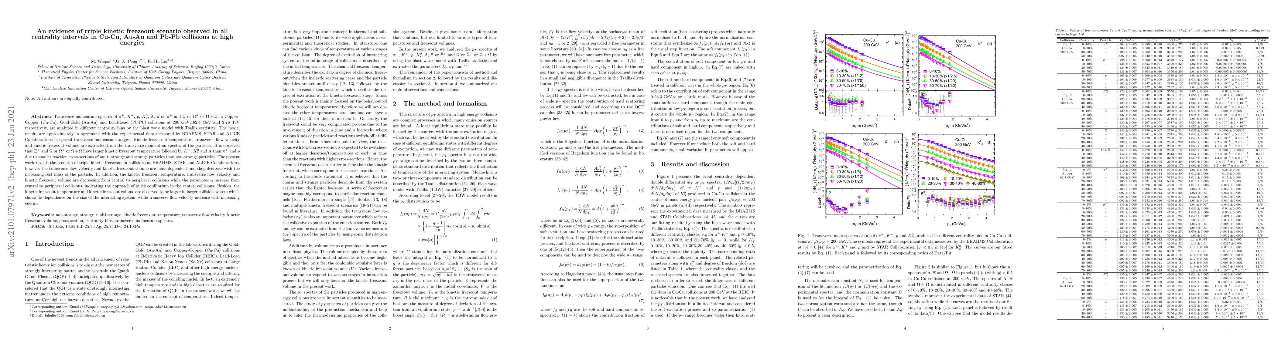 Transverse momentum spectra of $\pi^+$, $K^+$, $p$, $K^0_s$, $\Lambda$, $\Xi$ or $\bar\Xi^+$ and $\Omega$ or $\bar\Omega^+$ or $\Omega+\bar\Omega$ in Copper-Copper (Cu-Cu), Gold-Gold (Au-Au) and Lead-Lead (Pb-Pb) collisions at 200 GeV, 62.4 GeV and 2.76 TeV respectively, are analyzed in different centrality bins by the blast wave model with Tsallis statistics. The model results are approximately in agreement with the experimental data measured by BRAHMS, STAR and ALICE Collaborations in special transverse momentum ranges. Kinetic freeze out temperature, transverse flow velocity and kinetic freezeout volume are extracted from the transverse momentum spectra of the particles. It is observed that $\bar\Xi^+$ and $\Omega$ or $\bar\Omega^+$ or $\Omega+\bar\Omega$ have larger kinetic freezeout temperature followed by $K^+$, $K^0_s$ and $\Lambda$ than $\pi^+$ and $p$ due to smaller reaction cross-sections of multi-strange and strange particles than non-strange particles. The present work reveals the scenario of triple kinetic freezeout in collisions at BRAHMS, STAR and ALICE Collaborations, however the transverse flow velocity and kinetic freezeout volume are mass dependent and they decrease with the increasing rest mass of the particle. In addition, the kinetic freezeout temperature, transverse flow velocity and kinetic freezeout volume are decreasing from central to peripheral collisions while the parameter q increase from central to peripheral collisions, indicating the approach of quick equilibrium in the central collisions. Besides, the kinetic freezeout temperature and kinetic freezeout volume are observed to be larger in larger collision system which shows its dependence on the size of the interacting system, while transverse flow velocity increase with increasing energy.