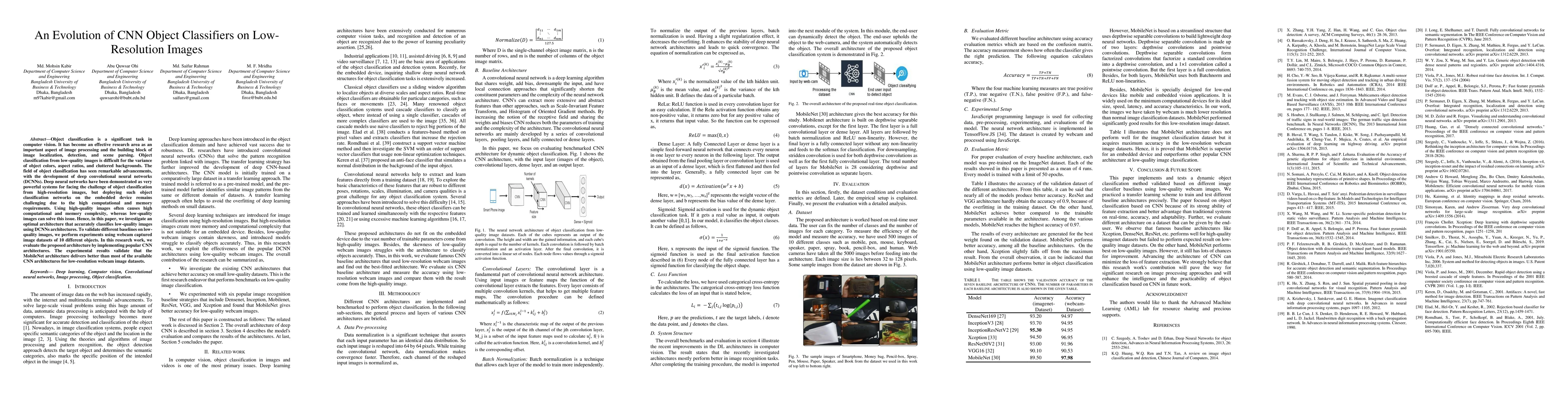 Object classification is a significant task in computer vision. It has become an effective research area as an important aspect of image processing and the building block of image localization, detection, and scene parsing. Object classification from low-quality images is difficult for the variance of object colors, aspect ratios, and cluttered backgrounds. The field of object classification has seen remarkable advancements, with the development of deep convolutional neural networks (DCNNs). Deep neural networks have been demonstrated as very powerful systems for facing the challenge of object classification from high-resolution images, but deploying such object classification networks on the embedded device remains challenging due to the high computational and memory requirements. Using high-quality images often causes high computational and memory complexity, whereas low-quality images can solve this issue. Hence, in this paper, we investigate an optimal architecture that accurately classifies low-quality images using DCNNs architectures. To validate different baselines on lowquality images, we perform experiments using webcam captured image datasets of 10 different objects. In this research work, we evaluate the proposed architecture by implementing popular CNN architectures. The experimental results validate that the MobileNet architecture delivers better than most of the available CNN architectures for low-resolution webcam image datasets.
