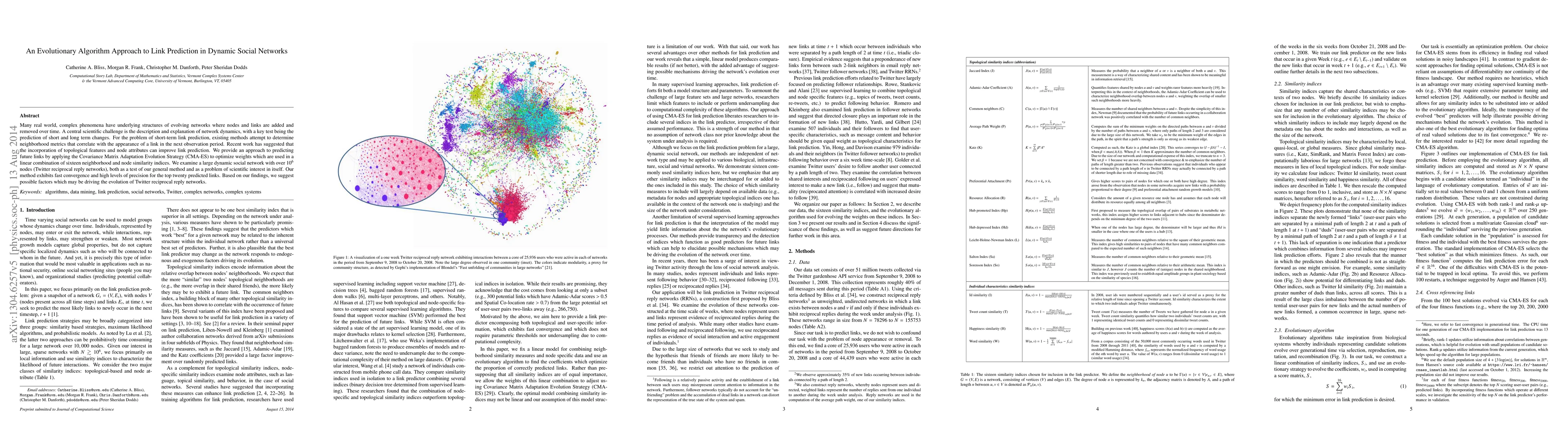 Many real world, complex phenomena have underlying structures of evolving networks where nodes and links are added and removed over time. A central scientific challenge is the description and explanation of network dynamics, with a key test being the prediction of short and long term changes. For the problem of short-term link prediction, existing methods attempt to determine neighborhood metrics that correlate with the appearance of a link in the next observation period. Recent work has suggested that the incorporation of topological features and node attributes can improve link prediction. We provide an approach to predicting future links by applying the Covariance Matrix Adaptation Evolution Strategy (CMA-ES) to optimize weights which are used in a linear combination of sixteen neighborhood and node similarity indices. We examine a large dynamic social network with over $10^6$ nodes (Twitter reciprocal reply networks), both as a test of our general method and as a problem of scientific interest in itself. Our method exhibits fast convergence and high levels of precision for the top twenty predicted links. Based on our findings, we suggest possible factors which may be driving the evolution of Twitter reciprocal reply networks.