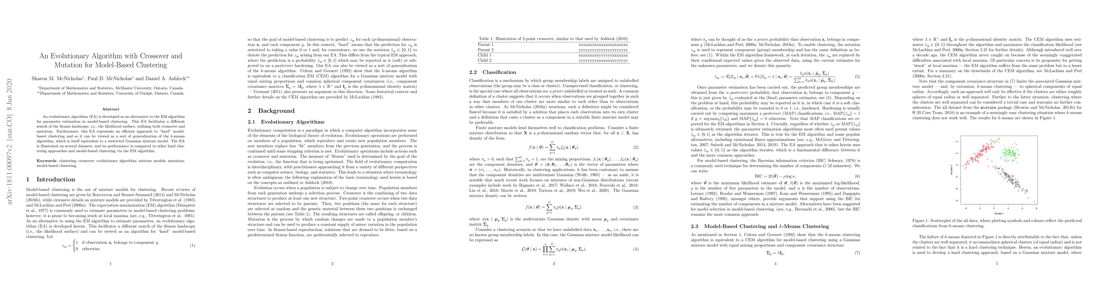 This paper proposes an evolutionary algorithm (EA) for model-based clustering, utilizing crossover and mutation to explore the likelihood surface, offering an alternative to the EM algorithm. The EA's performance is compared against other clustering methods on various datasets.