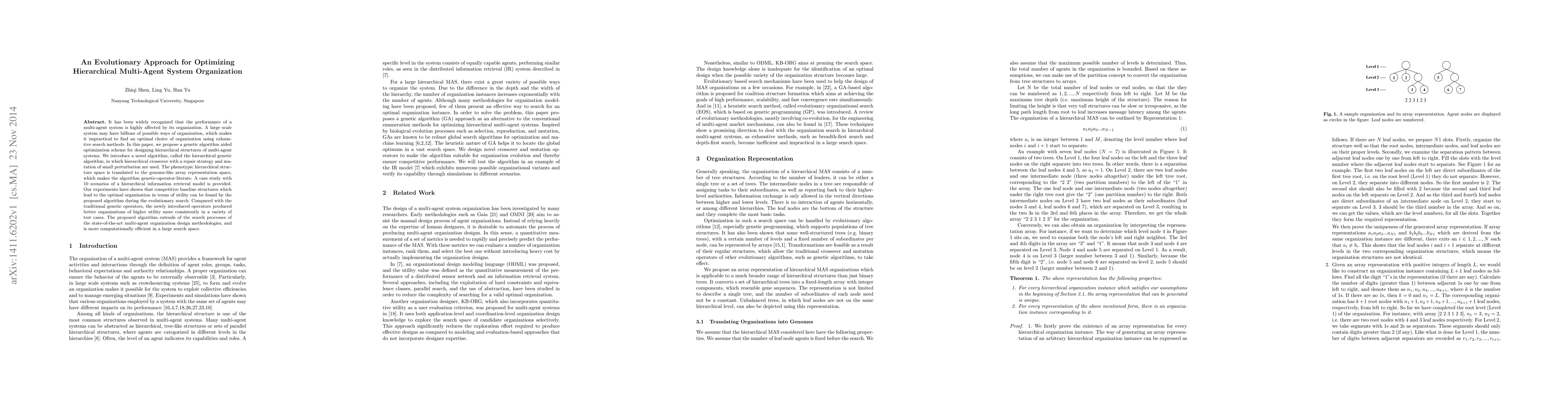 This paper introduces a hierarchical genetic algorithm to optimize the organization of large-scale multi-agent systems, making the search for optimal structures more efficient and consistent than traditional methods. Experiments demonstrate its effectiveness in various test cases, including a hierarchical information retrieval model.