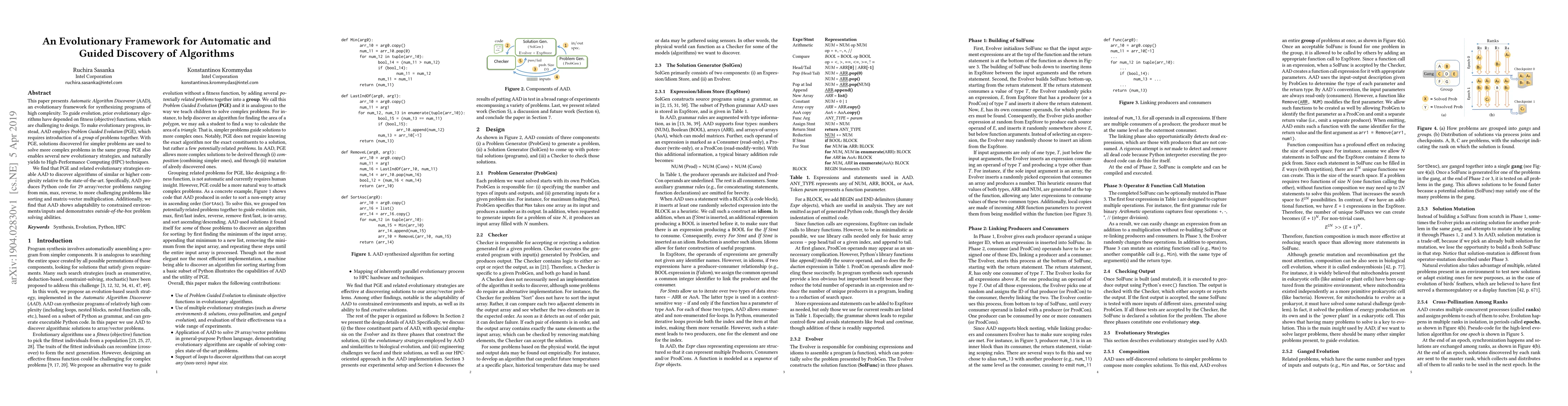 This paper introduces Automatic Algorithm Discoverer (AAD), an evolutionary framework that employs Problem Guided Evolution (PGE) to synthesize complex algorithms without predefined fitness functions. AAD discovers algorithms for 29 array/vector problems, showing adaptability and high-performance computing capabilities.