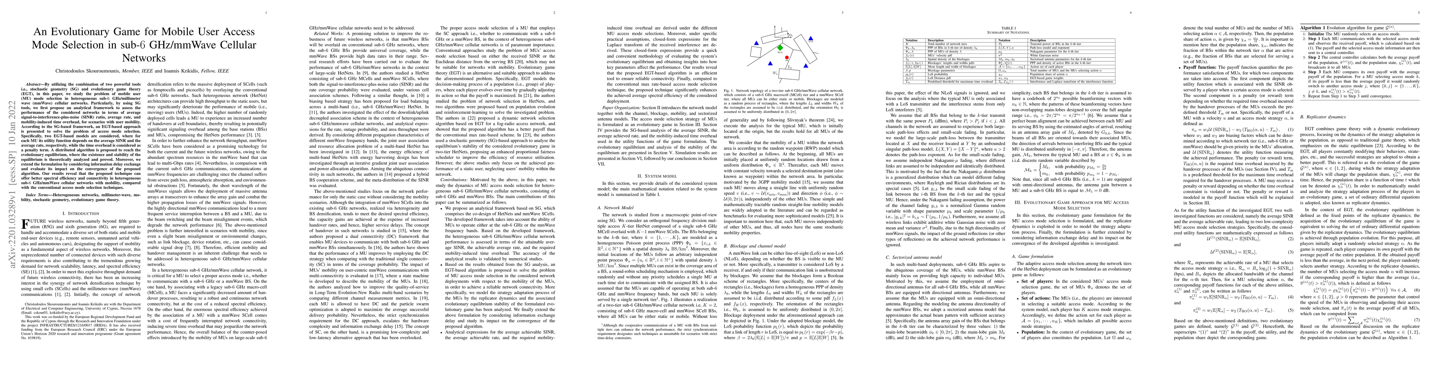 This paper combines stochastic geometry and evolutionary game theory to develop an analytical framework for mobile user access mode selection in heterogeneous sub-$6$ GHz/mmWave cellular networks, proposing a distributed algorithm that achieves evolutionary equilibrium and demonstrates improved spectral efficiency and connectivity.