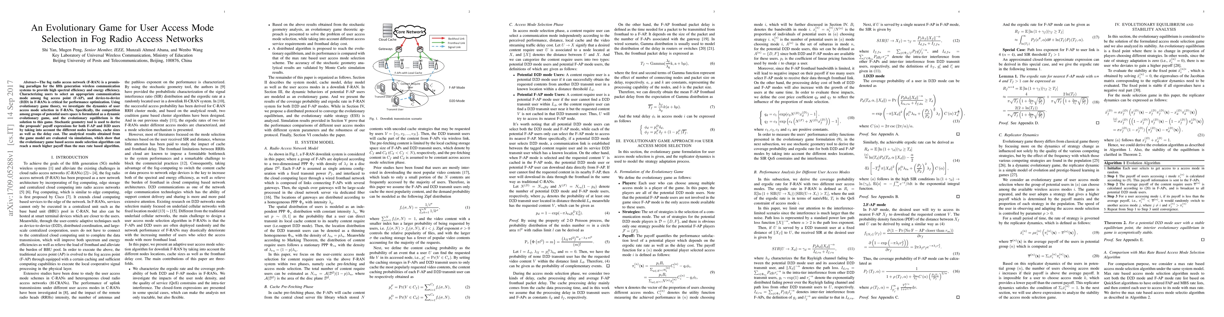 This paper uses evolutionary game theory to model user access mode selection in fog radio access networks (F-RANs), comparing fog access point (F-AP) and device-to-device (D2D) modes. The proposed evolutionary equilibrium algorithm achieves higher payoffs than max rate-based methods, as shown through simulations.