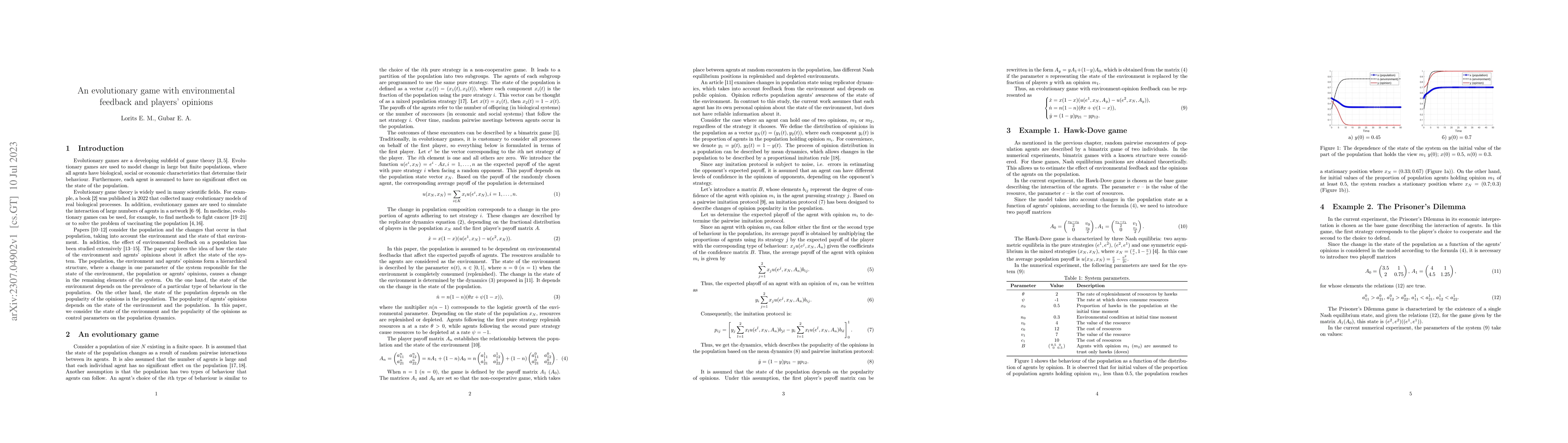 This paper explores an evolutionary game model incorporating environmental feedback and agents' opinions, analyzing two levels of interaction: environmental changes affecting population states and agents' evaluations influencing the state. Computational methods in MATLAB and numerical experiments are developed to study this hierarchical structure.