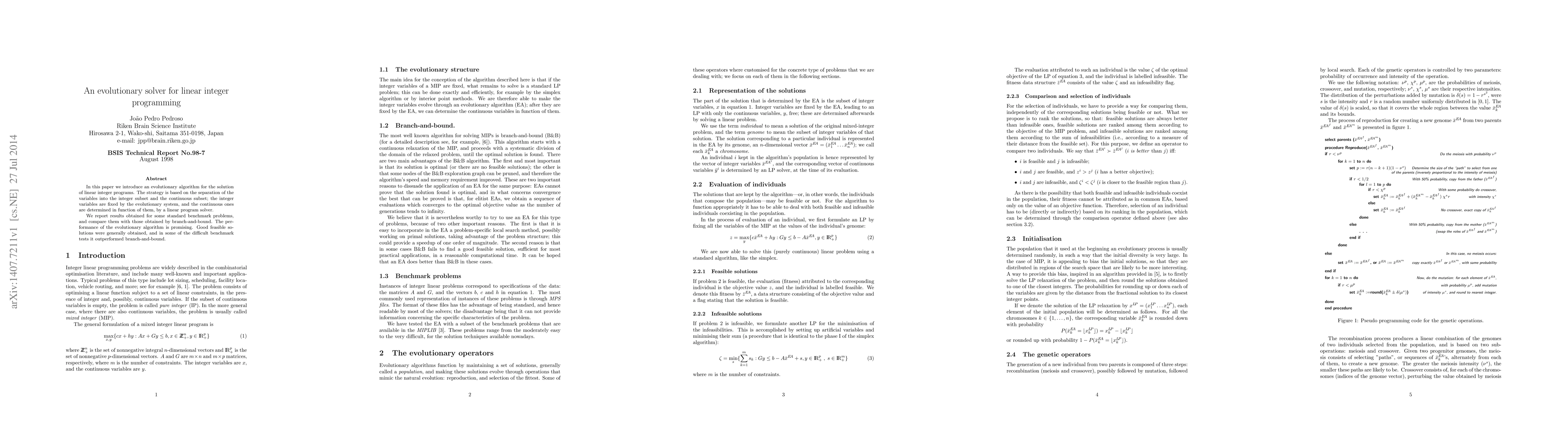This paper proposes an evolutionary algorithm to solve linear integer programming by separating variables into integer and continuous subsets, with the evolutionary system fixing the integer variables and the continuous ones determined via a linear program solver. The algorithm shows promising results, often outperforming branch-and-bound on standard benchmark problems.