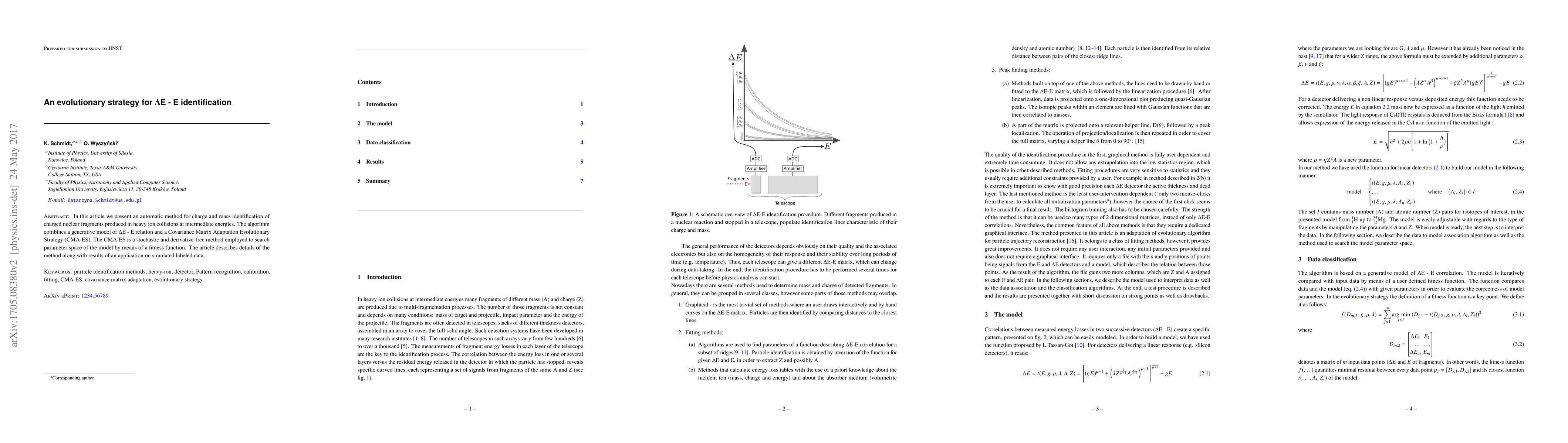 In this article we present an automatic method for charge and mass identification of charged nuclear fragments produced in heavy ion collisions at intermediate energies. The algorithm combines a generative model of DeltaE - E relation and a Covariance Matrix Adaptation Evolutionary Strategy (CMA-ES). The CMA-ES is a stochastic and derivative-free method employed to search parameter space of the model by means of a fitness function. The article describes details of the method along with results of an application on simulated labeled data.