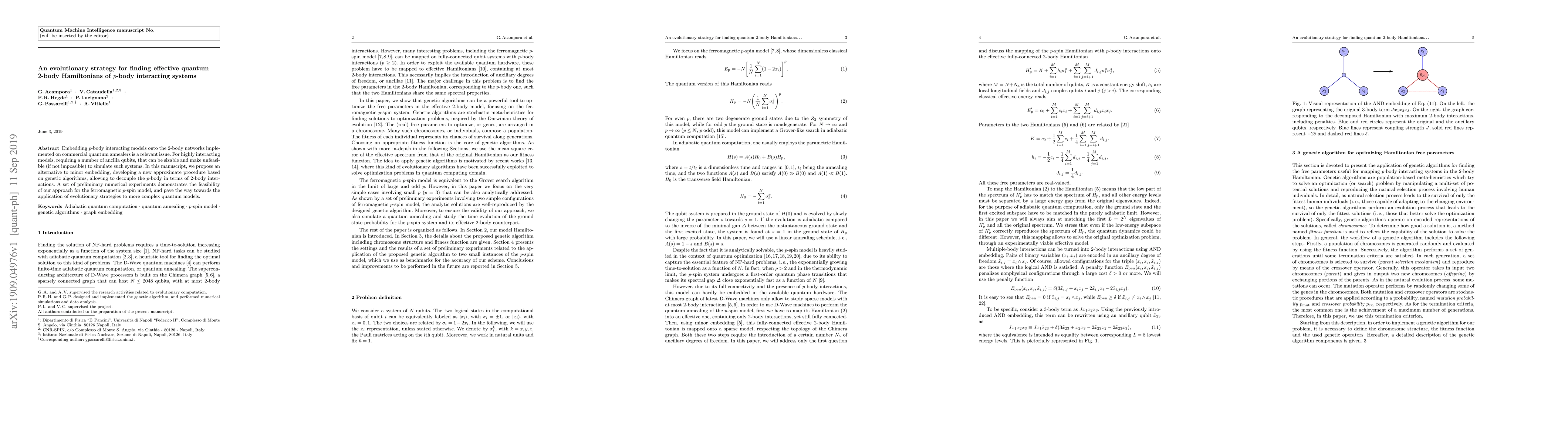 Embedding $p$-body interacting models onto the $2$-body networks implemented on commercial quantum annealers is a relevant issue. For highly interacting models, requiring a number of ancilla qubits, that can be sizable and make unfeasible (if not impossible) to simulate such systems. In this manuscript, we propose an alternative to minor embedding, developing a new approximate procedure based on genetic algorithms, allowing to decouple the $p$-body in terms of $2$-body interactions. A set of preliminary numerical experiments demonstrates the feasibility of our approach for the ferromagnetic $p$-spin model, and pave the way towards the application of evolutionary strategies to more complex quantum models.