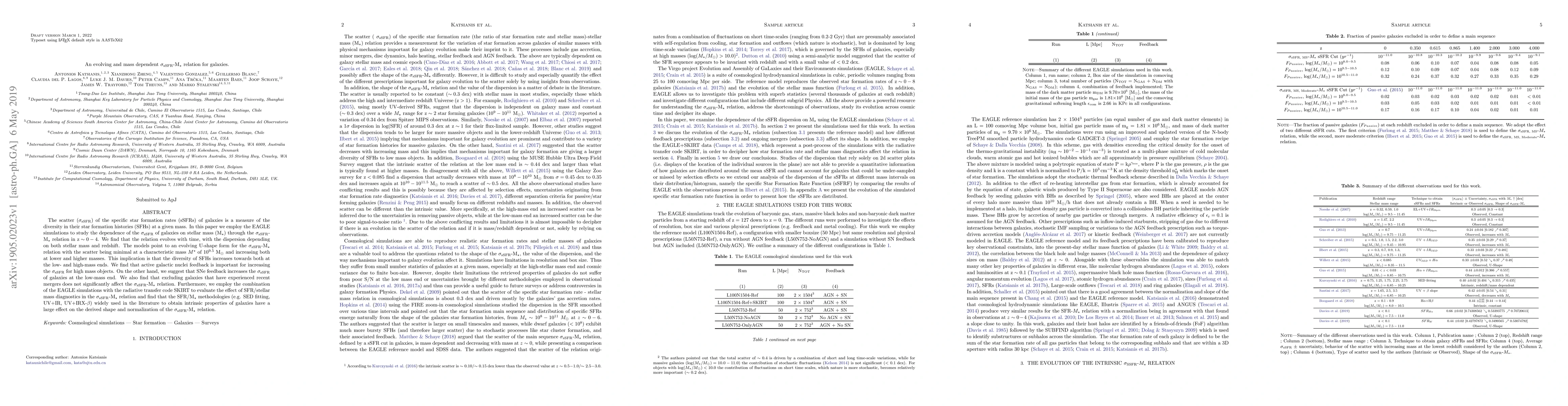The scatter (${\rm\sigma_{\text{sSFR}}}$) of the specific star formation rates (sSFRs) of galaxies is a measure of the diversity in their star formation histories (SFHs) at a given mass. In this paper we employ the EAGLE simulations to study the dependence of the ${\rm \sigma_{\text{sSFR}}}$ of galaxies on stellar mass (${\rm M_{\star}}$) through the ${\rm \sigma_{\text{sSFR}}}$-${\rm M_{\star}}$ relation in $ {\rm z \sim 0-4}$. We find that the relation evolves with time, with the dispersion depending on both stellar mass and redshift. The models point to an evolving U-shape form for the ${\rm \sigma_{\text{sSFR}}}$-${\rm M_{\star}}$ relation with the scatter being minimal at a characteristic mass $M^{\star}$ of ${\rm 10^{9.5}}$ ${\rm M_{\odot}}$ and increasing both at lower and higher masses. This implication is that the diversity of SFHs increases towards both at the low- and high-mass ends. We find that active galactic nuclei feedback is important for increasing the ${\rm \sigma_{\text{sSFR}}}$ for high mass objects. On the other hand, we suggest that SNe feedback increases the ${\rm \sigma_{\text{sSFR}}}$ of galaxies at the low-mass end. We also find that excluding galaxies that have experienced recent mergers does not significantly affect the ${\rm \sigma_{\text{sSFR}}}$-${\rm M_{\star}}$ relation. Furthermore, we employ the combination of the EAGLE simulations with the radiative transfer code SKIRT to evaluate the effect of SFR/stellar mass diagnostics in the ${\rm \sigma_{\text{sSFR}}}$-${\rm M_{\star}}$ relation and find that the ${\rm SFR/M_{\star}}$ methodologies (e.g. SED fitting, UV+IR, UV+IRX-$\beta$) widely used in the literature to obtain intrinsic properties of galaxies have a large effect on the derived shape and normalization of the ${\rm \sigma_{\text{sSFR}}}$-${\rm M_{\star}}$ relation.