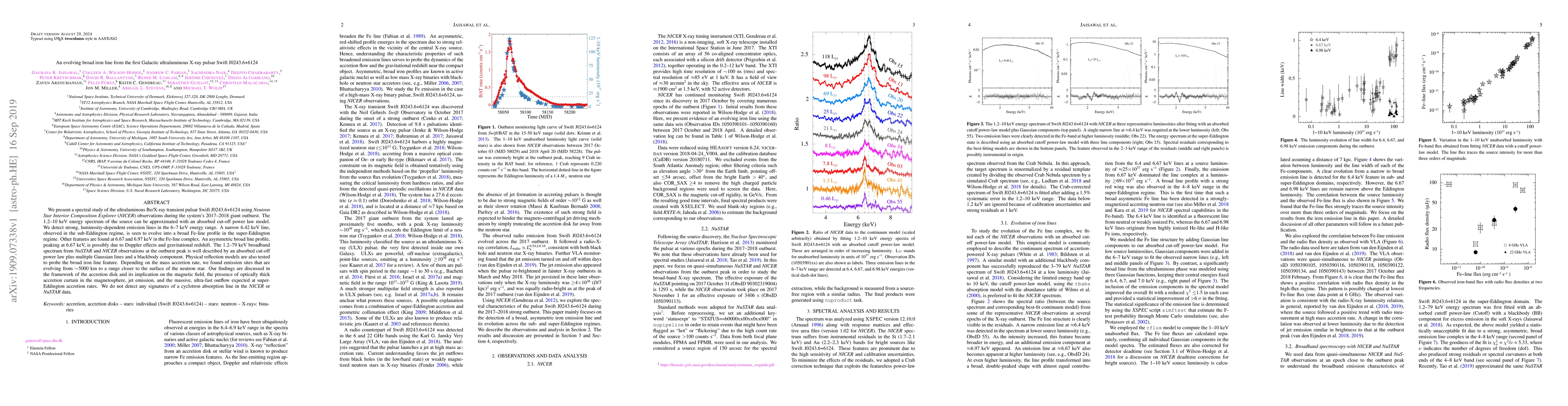 This study investigates the spectral evolution of the ultraluminous X-ray pulsar Swift J0243.6+6124 using NICER and NuSTAR data, revealing a broad iron line that evolves from a narrow line with Doppler effects and gravitational redshift, suggesting changes in emission sites and accretion dynamics. No cyclotron absorption lines were detected.