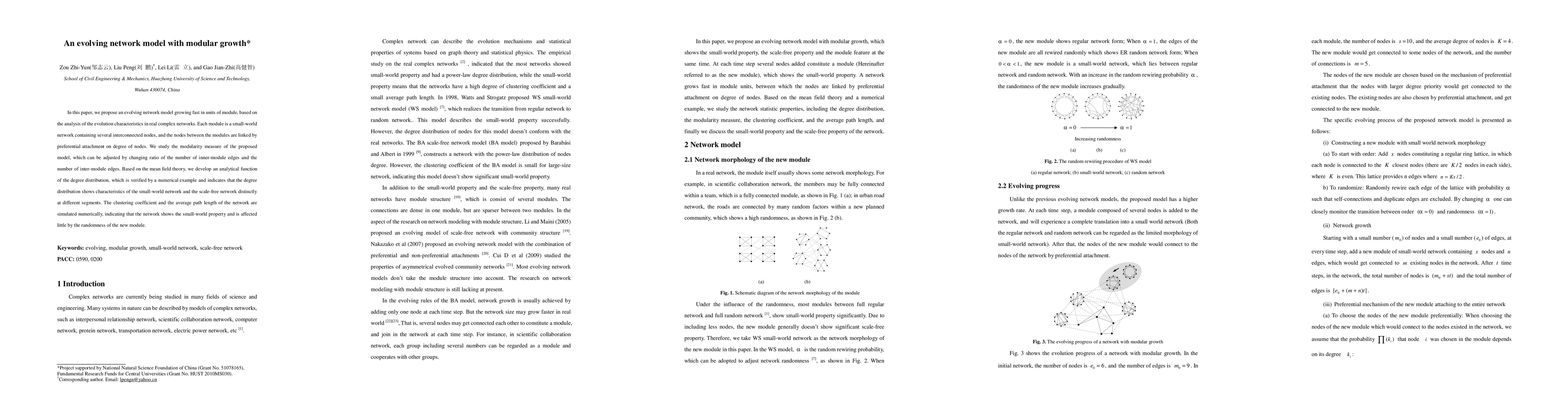 This research proposes a growing network model with modular growth, adjusting modularity through edge ratios, and demonstrates small-world properties with limited impact from new module randomness.