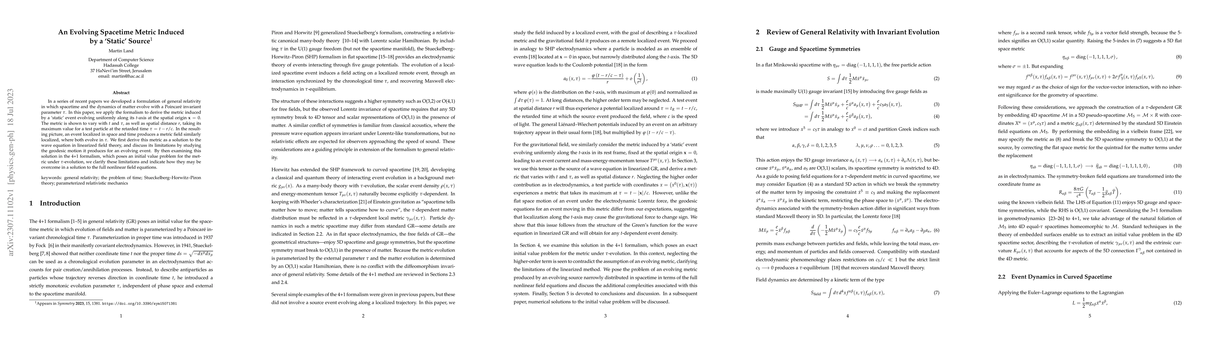 In a series of recent papers we developed a formulation of general relativity in which spacetime and the dynamics of matter evolve with a Poincar\'e invariant parameter $\tau$. In this paper, we apply the formalism to derive the metric induced by a `static' event evolving uniformly along its $t$-axis at the spatial origin ${\mathbf x} = 0$. The metric is shown to vary with $t$ and $\tau$, as well as spatial distance $r$, taking its maximum value for a test particle at the retarded time $\tau = t - r/c$. In the resulting picture, an event localized in space and time produces a metric field similarly localized, where both evolve in $\tau$. We first derive this metric as a solution to the wave equation in linearized field theory, and discuss its limitations by studying the geodesic motion it produces for an evolving event. By then examining this solution in the 4+1 formalism, which poses an initial value problem for the metric under $\tau$-evolution, we clarify these limitations and indicate how they may be overcome in a solution to the full nonlinear field equations.
