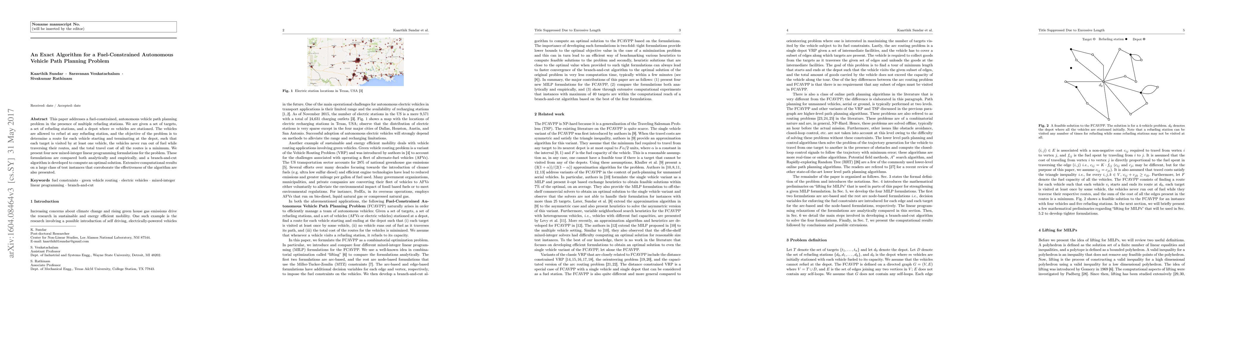 This paper proposes an exact algorithm for solving the fuel-constrained autonomous vehicle path planning problem with multiple refueling stations, utilizing mixed-integer linear programming formulations and a branch-and-cut approach to find the optimal routes that minimize travel costs while ensuring all targets are visited and vehicles do not run out of fuel. Computational results validate the algorithm's effectiveness.