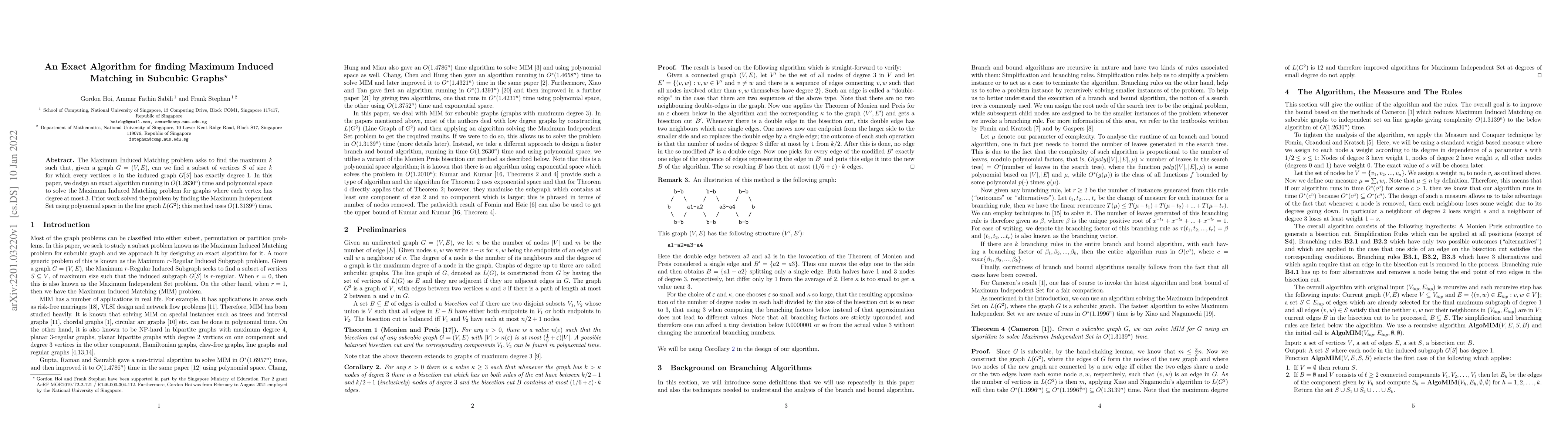 The Maximum Induced Matching problem asks to find the maximum $k$ such that, given a graph $G=(V,E)$, can we find a subset of vertices $S$ of size $k$ for which every vertices $v$ in the induced graph $G[S]$ has exactly degree $1$. In this paper, we design an exact algorithm running in $O(1.2630^n)$ time and polynomial space to solve the Maximum Induced Matching problem for graphs where each vertex has degree at most 3. Prior work solved the problem by finding the Maximum Independent Set using polynomial space in the line graph $L(G^2)$; this method uses $O(1.3139^n)$ time.