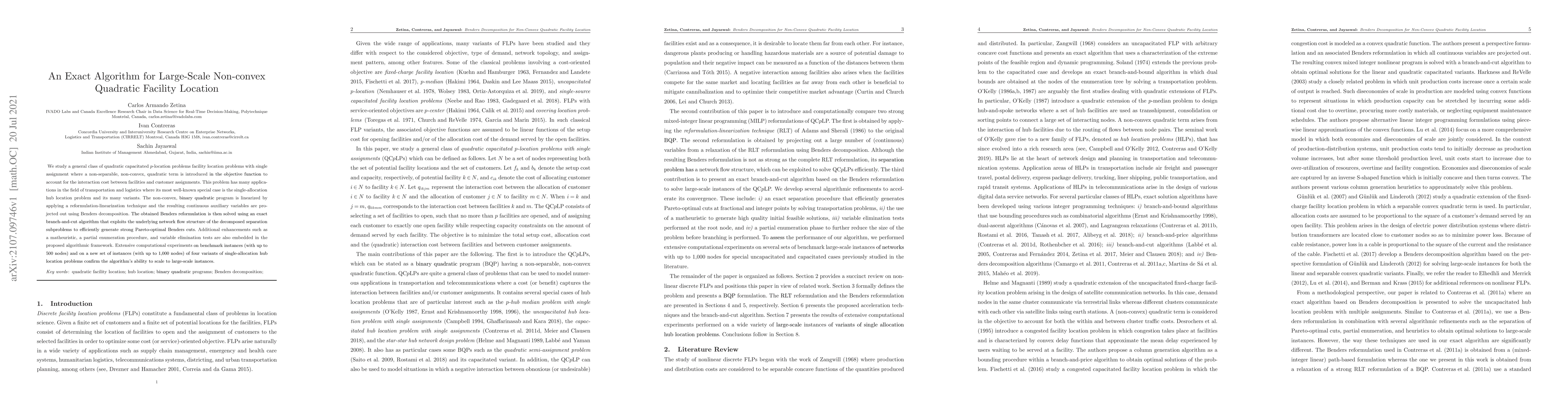 This paper presents an exact algorithm for solving large-scale non-convex quadratic facility location problems, linearizing the non-convex quadratic term via reformulation-linearization and employing Benders decomposition. The algorithm scales to instances with up to 1,000 nodes, confirmed through extensive computational experiments.