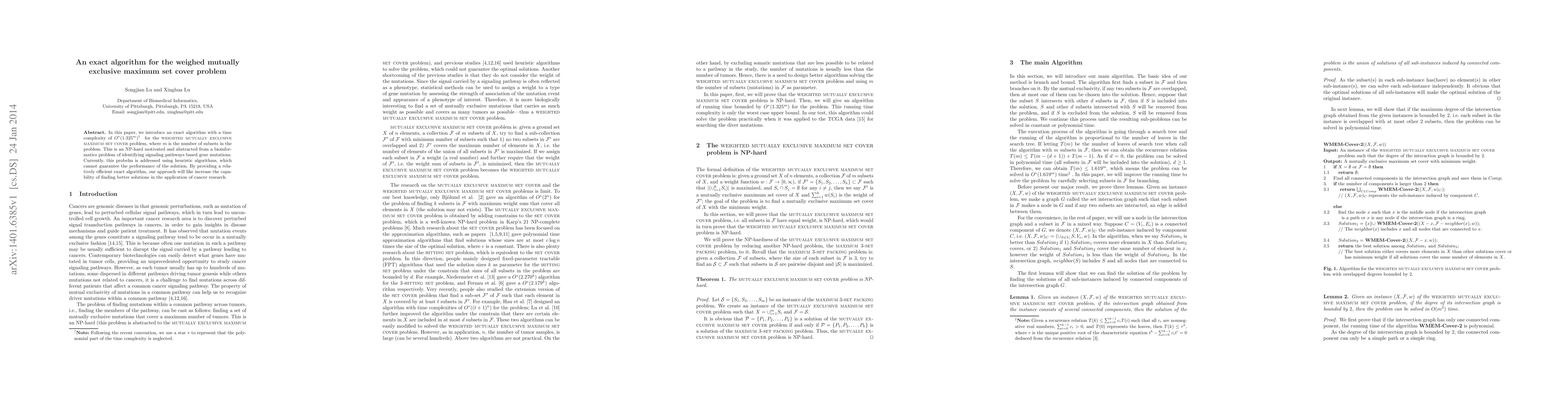 This paper presents an exact algorithm with a time complexity of $O^*(1.325^m)$ for the weighted mutually exclusive maximum set cover problem, addressing an NP-hard problem abstracted from bioinformatics. This approach aims to improve solution quality in cancer research compared to existing heuristic methods.