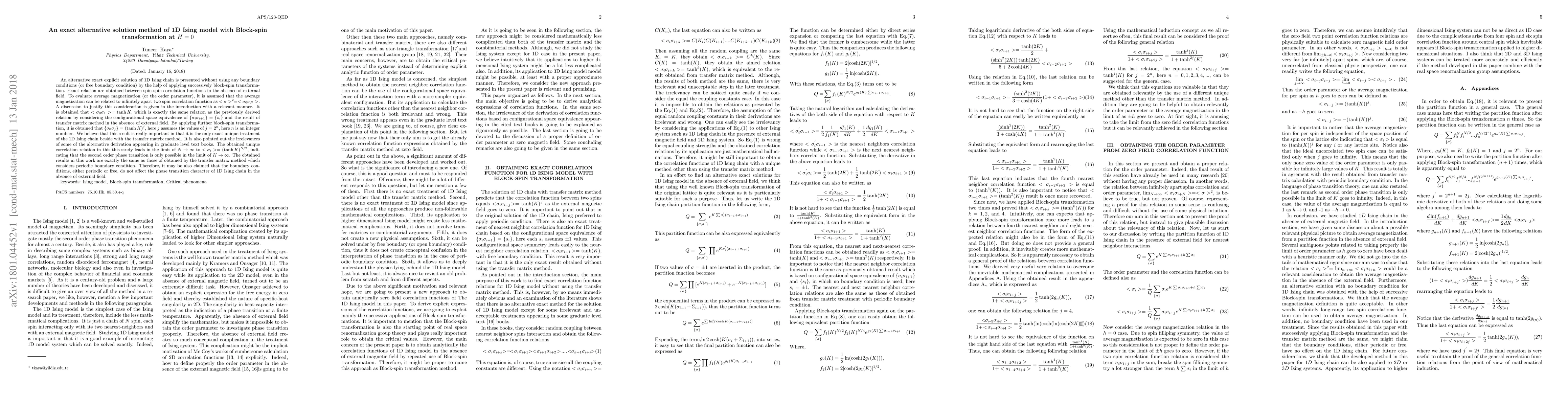 An alternative exact explicit solution of 1D Ising chain is presented without using any boundary conditions (or free boundary condition) by the help of applying successively block-spin transformation. Exact relation are obtained between spin-spin correlation functions in the absence of external field. To evaluate average magnetization (or the order parameter), it is assumed that the average magnetization can be related to infinitely apart two spin correlation function as $<\sigma>^{2}=<\sigma_{0}\sigma_{N}>$. A discussion to justify this consideration is given in the introduction with a relevant manner. It is obtained that $<\sigma_{0}\sigma_{1}>=\tanh{K}$, which is exactly the same relation as the previously derived relation by considering the configurational space equivalence of $\{\sigma_{i}\sigma_{i+1}\}=\{s_{i}\}$ and the result of transfer matrix method in the absence of external field. By applying further block-spin transformation, it is obtained that $\{\sigma_{0}\sigma_{j}\}=(\tanh{K})^{j}$, here $j$ assumes the values of $j=2^n$, here $n$ is an integer numbers. We believe that this result is really important in that it is the only exact unique treatment of the 1D Ising chain beside with the transfer matrix method. It is also pointed out the irrelevances of some of the alternative derivation appearing in graduate level text books. The obtained unique correlation relation in this this study leads in the limit of $N\rightarrow\infty$ to $<\sigma_{i}>=(\tanh{K})^{N/2}$, indicating that the second order phase transition is only possible in the limit of $K\rightarrow\infty$. The obtained results in this work are exactly the same as those of obtained by the transfer matrix method which considers periodic boundary condition.