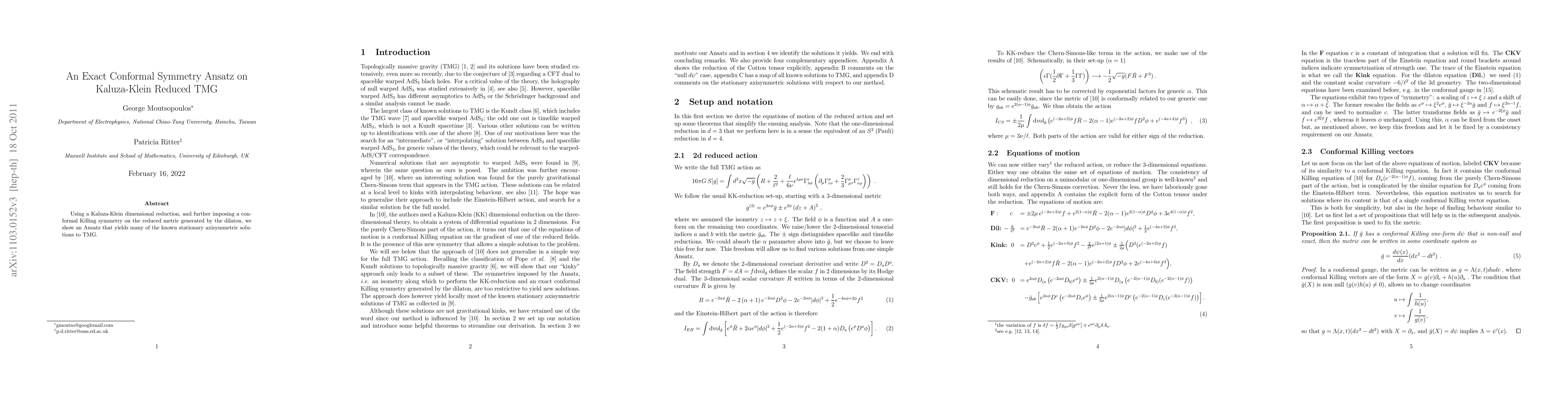 Title: An Exact Conformal Symmetry Ansatz on Kaluza-Klein Reduced TMG Summary: The paper proposes a conformal symmetry ansatz derived from Kaluza-Klein reduction, demonstrating its capability to generate known stationary axisymmetric solutions for the Topologically Massive Gravity (TMG) theory.