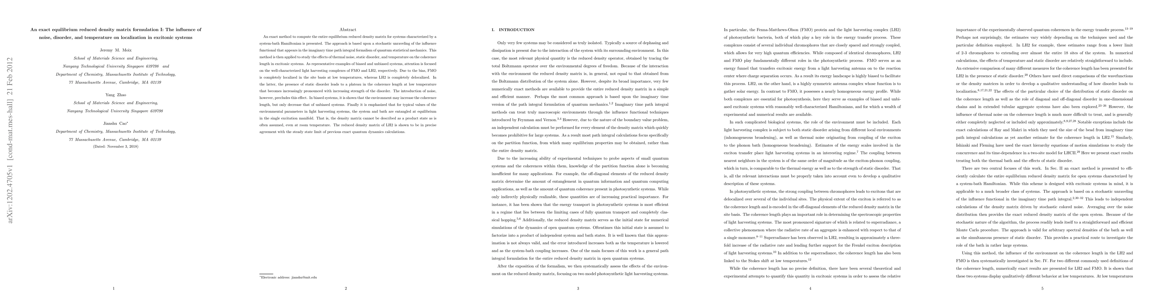 This paper presents an exact method to compute the equilibrium reduced density matrix for excitonic systems, revealing how thermal noise, static disorder, and temperature affect coherence length. It shows that in biased systems like FMO, coherence is maintained, while in unbiased systems like LH2, disorder causes delocalization, though noise disrupts this effect.