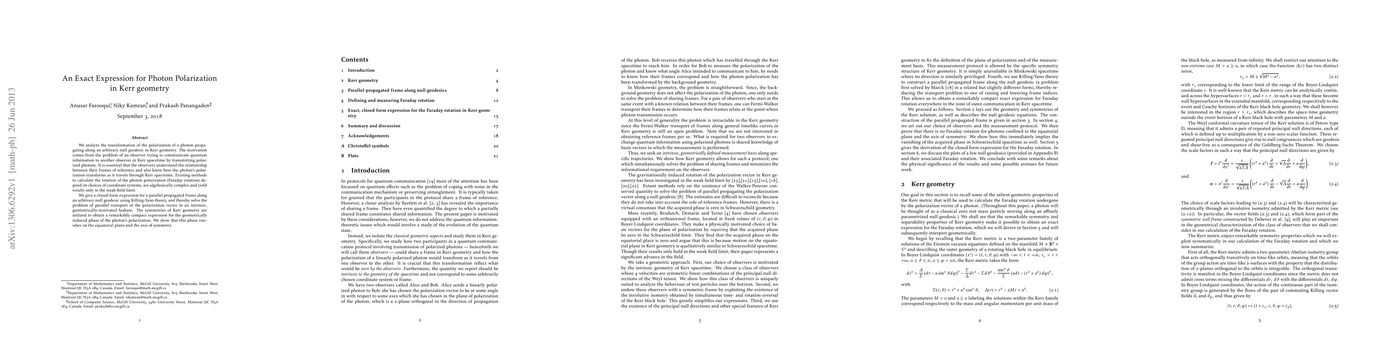 We analyze the transformation of the polarization of a photon propagating along an arbitrary null geodesic in Kerr geometry. The motivation comes from the problem of an observer trying to communicate quantum information to another observer in Kerr spacetime by transmitting polarized photons. It is essential that the observers understand the relationship between their frames of reference and also know how the photon's polarization transforms as it travels through Kerr spacetime. Existing methods to calculate the rotation of the photon polarization (Faraday rotation) depend on choices of coordinate systems, are algebraically complex and yield results only in the weak-field limit. We give a closed-form expression for a parallel propagated frame along an arbitrary null geodesic using Killing-Yano theory, and thereby solve the problem of parallel transport of the polarization vector in an intrinsic, geometrically-motivated fashion. The symmetries of Kerr geometry are utilized to obtain a remarkably compact expression for the geometrically induced phase of the photon's polarization. We show that this phase vanishes on the equatorial plane and the axis of symmetry.