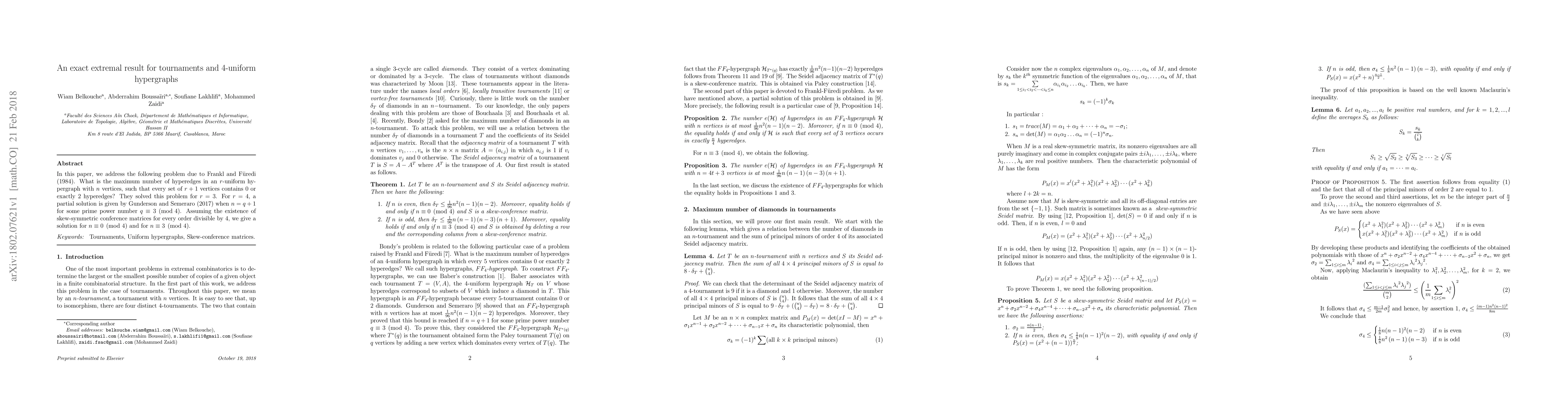 In this paper, we address the following problem due to Frankl and F\"uredi (1984). What is the maximum number of hyperedges in an $r$-uniform hypergraph with $n$ vertices, such that every set of $r+1$ vertices contains $0$ or exactly $2$ hyperedges? They solved this problem for $r=3$. For $r=4$, a partial solution is given by Gunderson and Semeraro (2017) when $n=q+1$ for some prime power number $q\equiv3\pmod{4} $. Assuming the existence of skew-symmetric conference matrices for every order divisible by $4$, we give a solution for $n\equiv0\pmod{4} $ and for $n\equiv3\pmod{4}$.