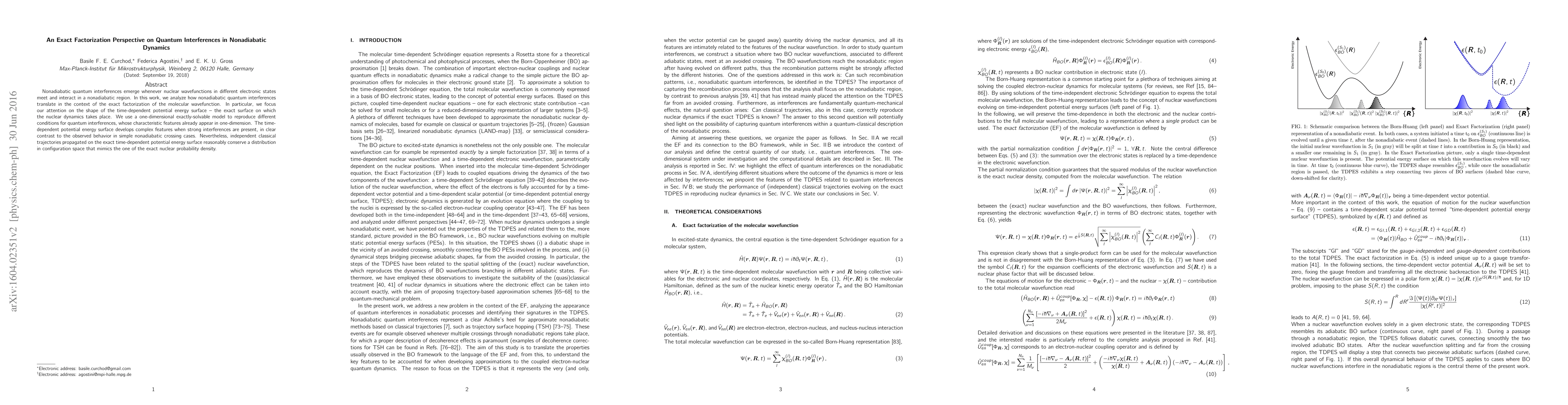 This paper explores how nonadiabatic quantum interferences affect the dynamics of molecules, finding that strong interferences lead to complex potential energy surfaces that still conserve a distribution similar to the exact nuclear probability density.