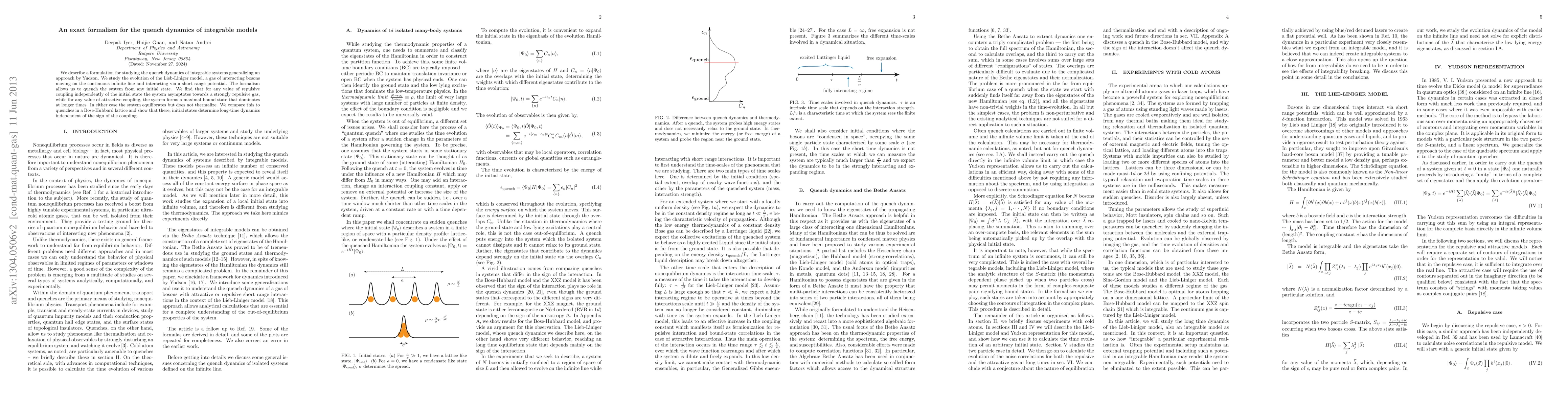 This paper develops a formalism for analyzing the quench dynamics in integrable models, specifically the Lieb-Liniger model, showing that systems asymptotically equilibrate but do not thermalize, differing from non-integrable systems like the Bose-Hubbard lattice where initial states dictate long-term behavior.