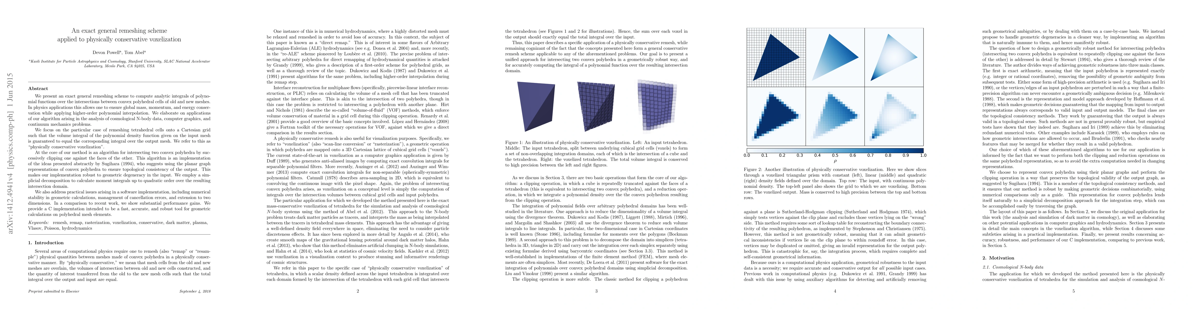 We present an exact general remeshing scheme to compute analytic integrals of polynomial functions over the intersections between convex polyhedral cells of old and new meshes. In physics applications this allows one to ensure global mass, momentum, and energy conservation while applying higher-order polynomial interpolation. We elaborate on applications of our algorithm arising in the analysis of cosmological N-body data, computer graphics, and continuum mechanics problems. We focus on the particular case of remeshing tetrahedral cells onto a Cartesian grid such that the volume integral of the polynomial density function given on the input mesh is guaranteed to equal the corresponding integral over the output mesh. We refer to this as "physically conservative voxelization". At the core of our method is an algorithm for intersecting two convex polyhedra by successively clipping one against the faces of the other. This algorithm is an implementation of the ideas presented abstractly by Sugihara (1994), who suggests using the planar graph representations of convex polyhedra to ensure topological consistency of the output. This makes our implementation robust to geometric degeneracy in the input. We employ a simplicial decomposition to calculate moment integrals up to quadratic order over the resulting intersection domain. We also address practical issues arising in a software implementation, including numerical stability in geometric calculations, management of cancellation errors, and extension to two dimensions. In a comparison to recent work, we show substantial performance gains. We provide a C implementation intended to be a fast, accurate, and robust tool for geometric calculations on polyhedral mesh elements.