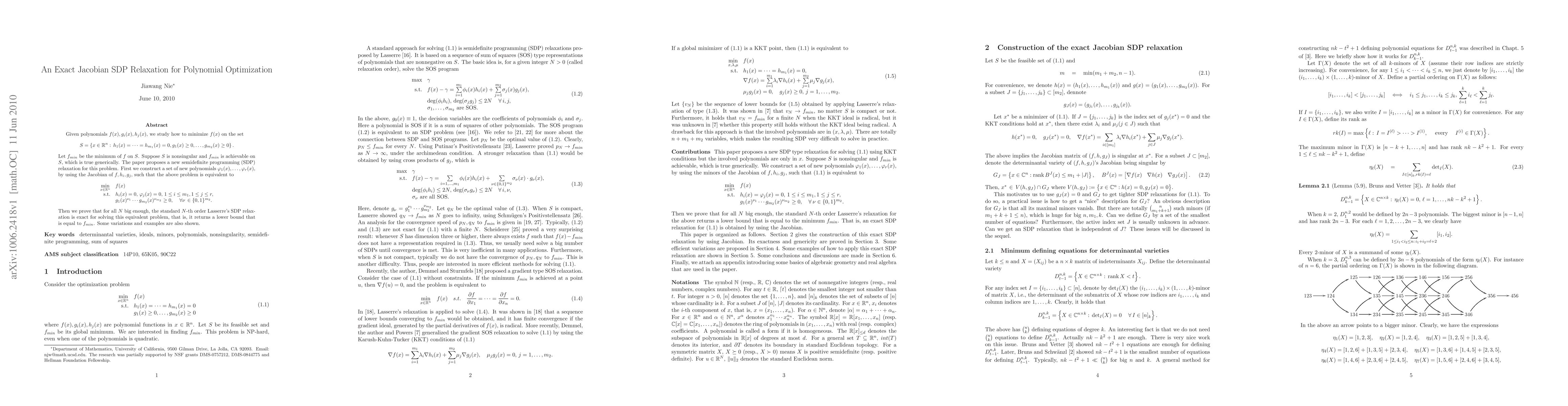 Given polynomials f(x), g_i(x), h_j(x), we study how to minimize f on the semialgebraic set S = { x \in R^n: h_1(x)=...=h_{m_1}(x) =0, g_1(x) >= 0, ..., g_{m_2}(x) >= 0}. Let f_{min} be the minimum of f on S. Suppose S is nonsingular and f_{min} is achievable on S,which is true generically. The paper proposes a new semidefinite programming (SDP) relaxation for this problem. First we construct a set of new polynomials \varphi_1(x), \ldots, \varphi_r(x), by using the Jacobian of f,h_i,g_j, such that the above problem is unchanged by adding new equations \varphi_j(x)=0. Then we prove that for all $N$ big enough, the standard N-th order Lasserre's SDP relaxation is exact for solving this equivalent problem, that is, it returns a lower bound that is equal to f_{min}. Some variations and examples are also shown.