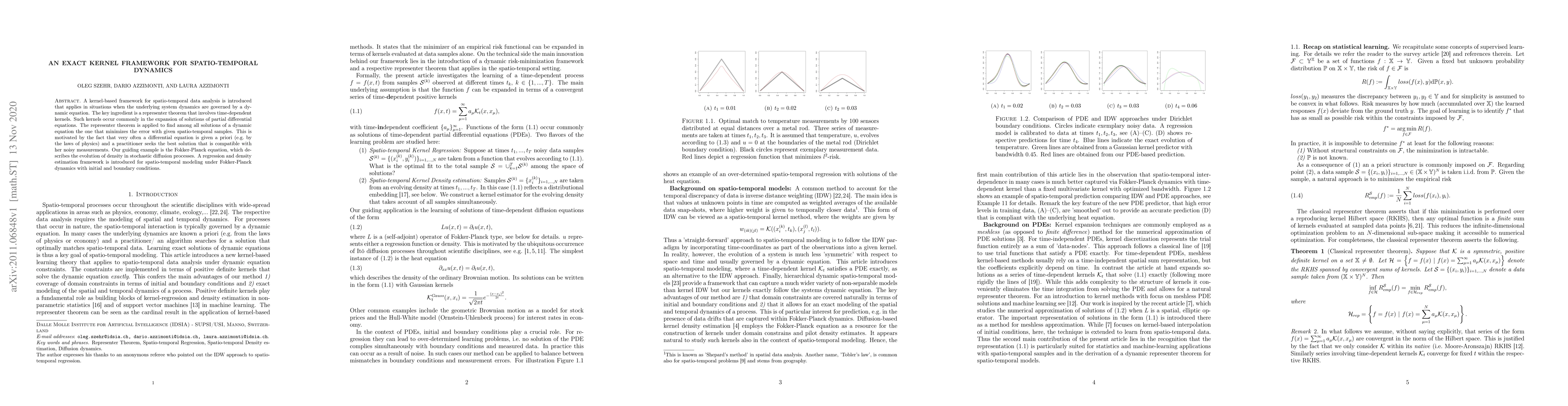 This paper introduces a kernel-based framework for analyzing spatio-temporal dynamics governed by dynamic equations, employing time-dependent kernels and a representer theorem to find the optimal solution compatible with noisy measurements. The Fokker-Planck equation serves as a guiding example for regression and density estimation in stochastic diffusion processes.