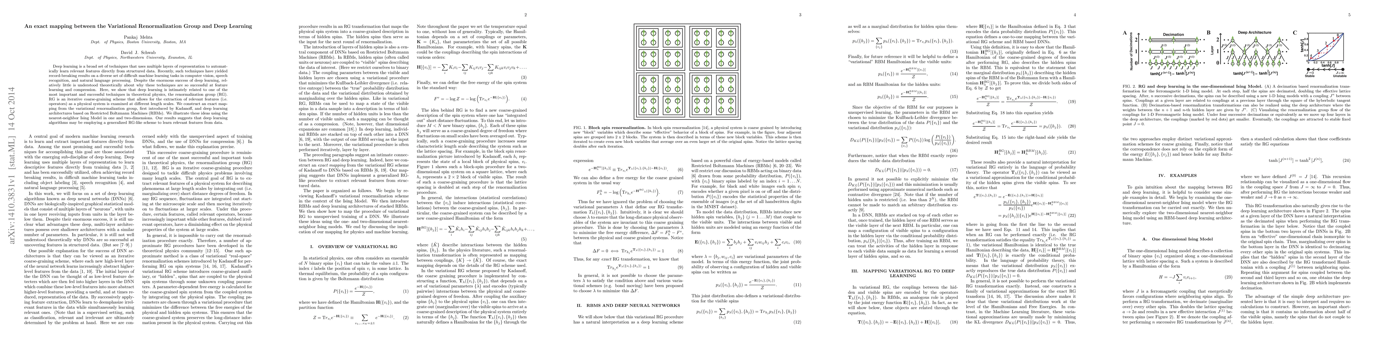 This paper establishes an exact mapping between the variational renormalization group and deep learning, particularly through Restricted Boltzmann Machines. It suggests that deep learning techniques may be utilizing a generalized renormalization group scheme to learn and compress features from data.