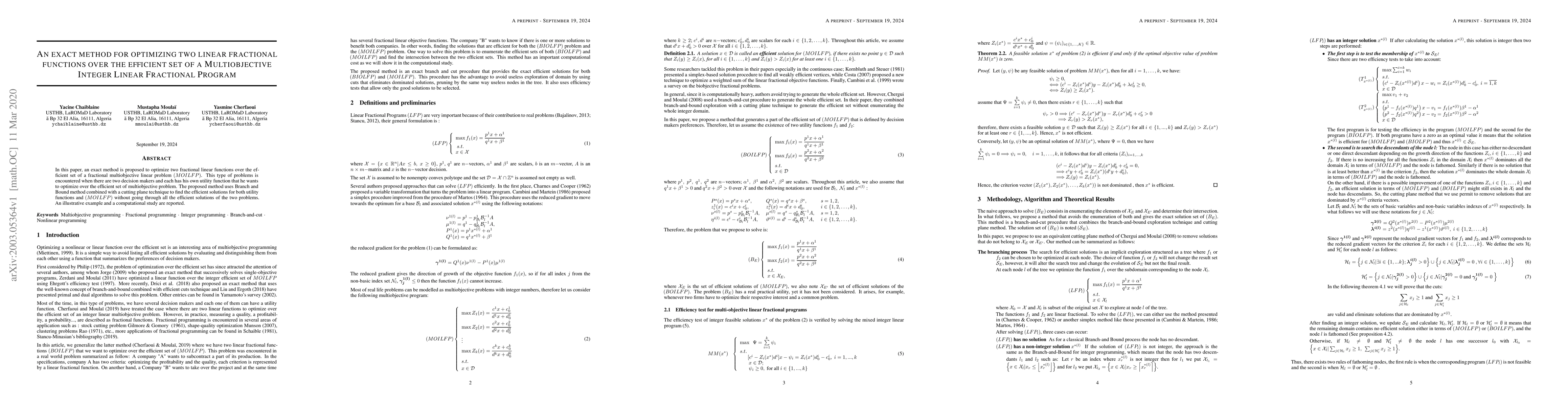 In this paper, an exact method is proposed to optimize two fractional linear functions over the efficient set of a fractional multiobjective linear problem (MOILFP). This type of problems is encountered when there are two decision makers and each has his own utility function that he wants to optimize over the efficient set of multiobjective problem. The proposed method uses Branch and Bound method combined with a cutting plane technique to find the efficient solutions for both utility functions and (MOILFP) without going through all the efficient solutions of the two problems. An illustrative example and a computational study are reported.